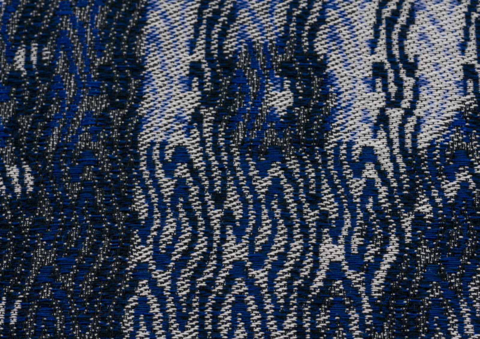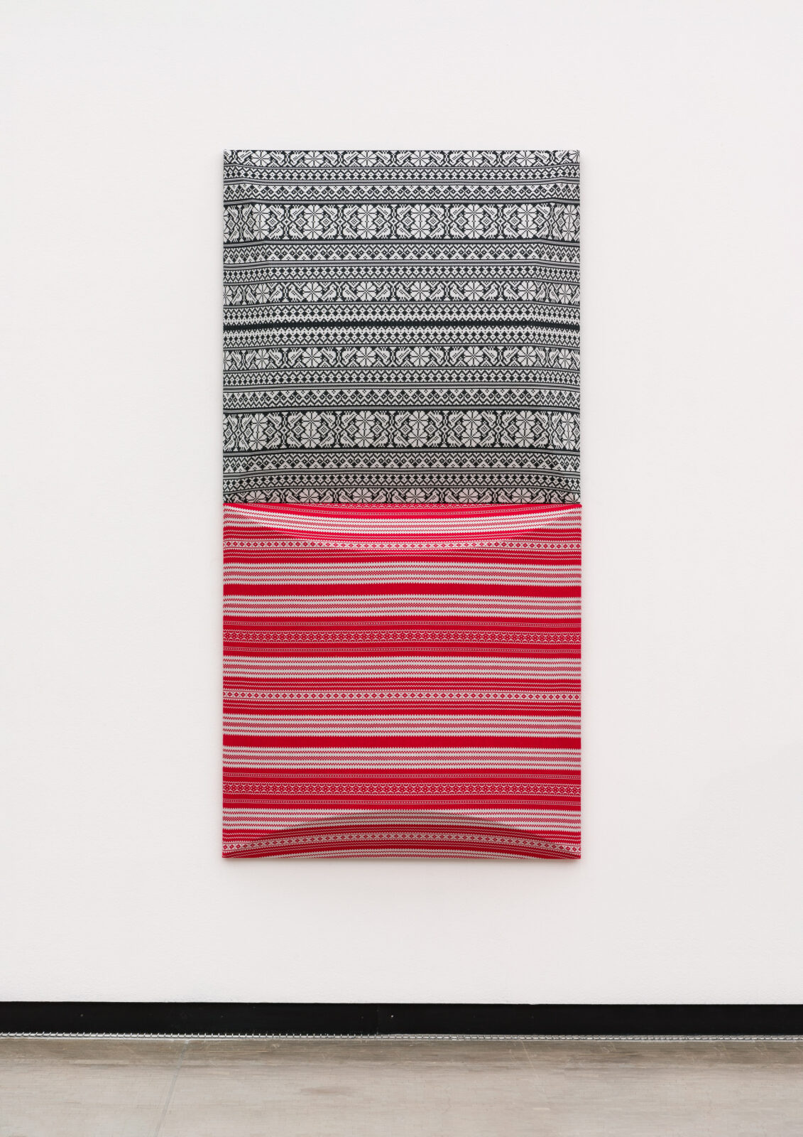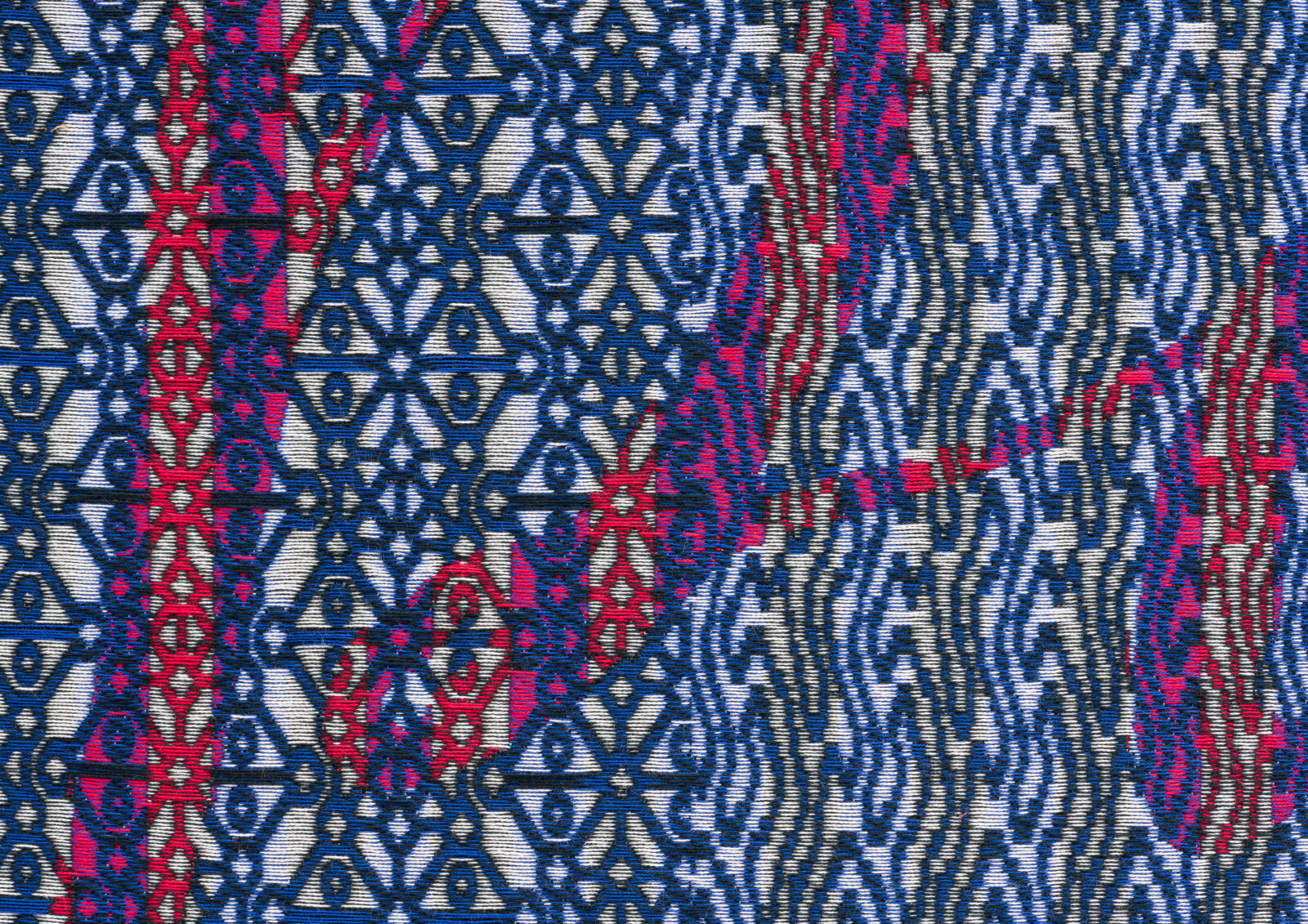 Kunstenaar Aleksandra Domanović speelt in haar werk graag met het bezoldeffect: een optische illusie vernoemd naar Wilhelm von Bezold, die het ontdekte bij het ontwerpen van vloerkleden. Hij beschreef hoe kleine vlakken in een bepaalde kleur verschillend worden waargenomen afhankelijk van de aangrenzende kleuren. Domanović verkende het effect eerder al in enorme prints die in 2021 te zien waren op de expositie ‘Becoming Another’ in Berlijn. In 2024 besloot ze het toe te passen in het medium waarin het ontdekt werd: een geweven stof.