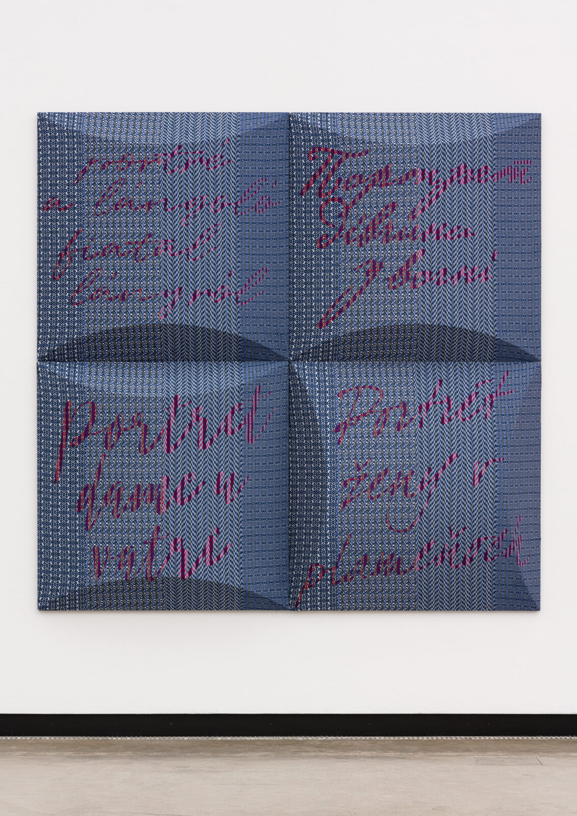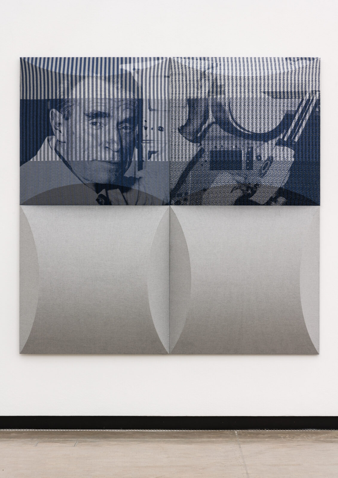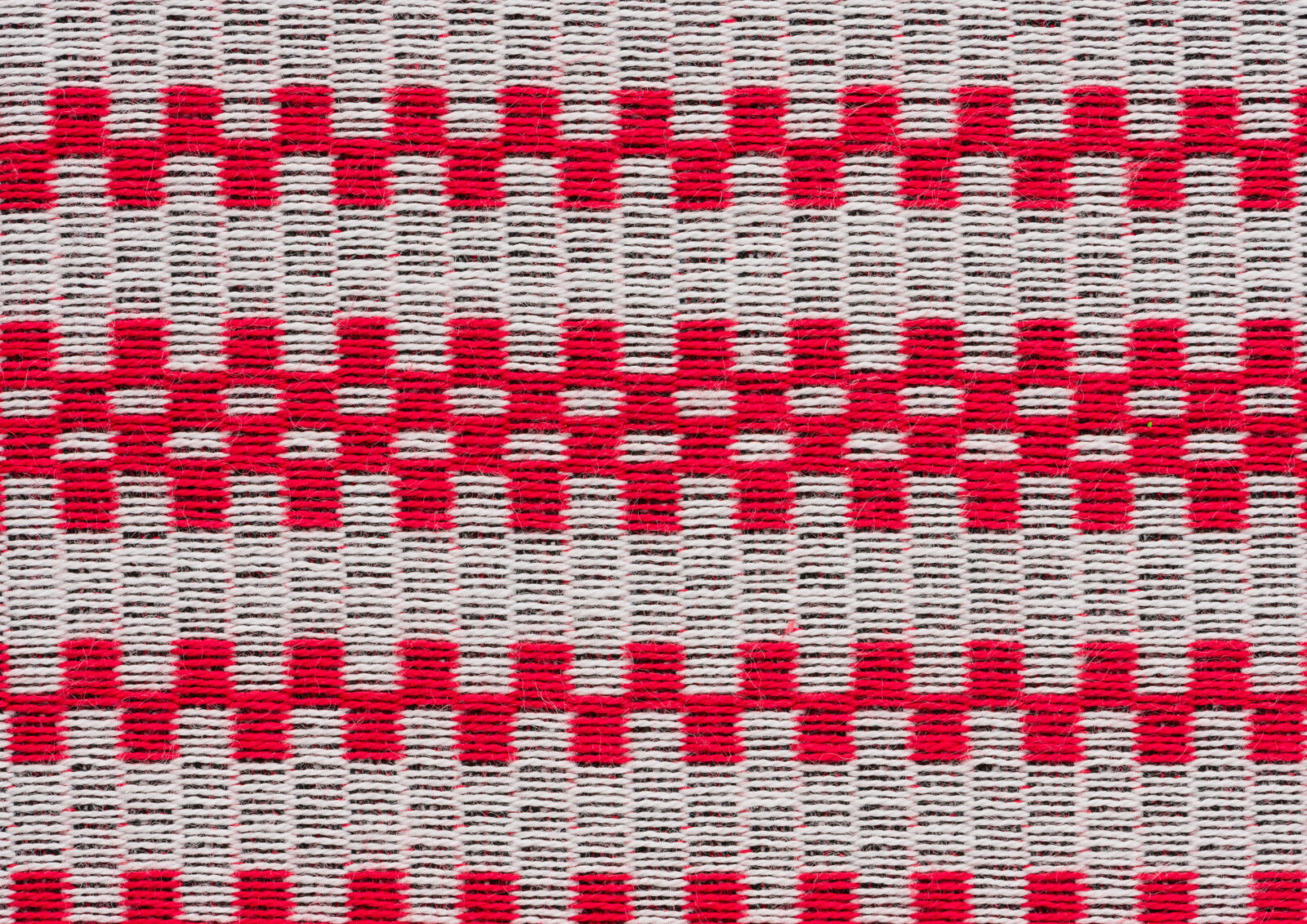 Kunstenaar Aleksandra Domanović speelt in haar werk graag met het bezoldeffect: een optische illusie vernoemd naar Wilhelm von Bezold, die het ontdekte bij het ontwerpen van vloerkleden. Hij beschreef hoe kleine vlakken in een bepaalde kleur verschillend worden waargenomen afhankelijk van de aangrenzende kleuren. Domanović verkende het effect eerder al in enorme prints die in 2021 te zien waren op de expositie ‘Becoming Another’ in Berlijn. In 2024 besloot ze het toe te passen in het medium waarin het ontdekt werd: een geweven stof.