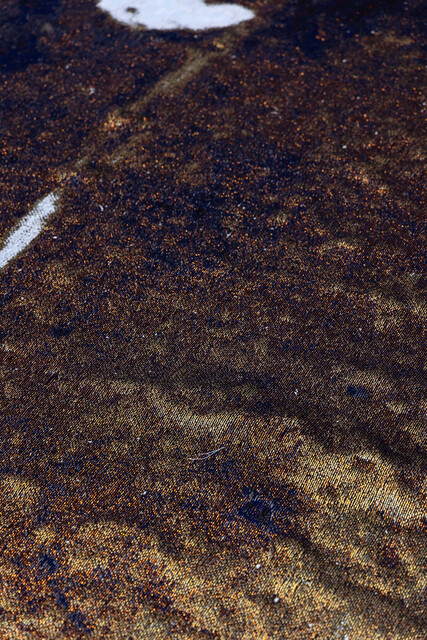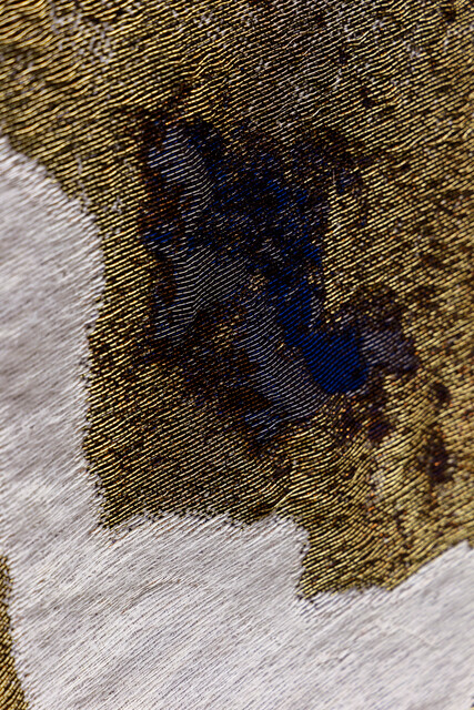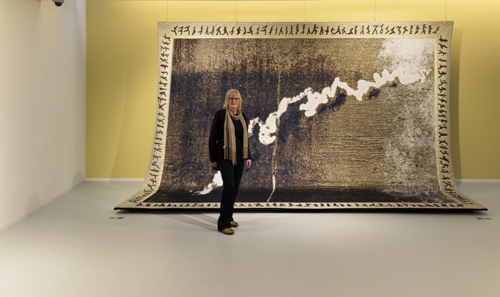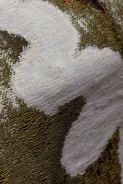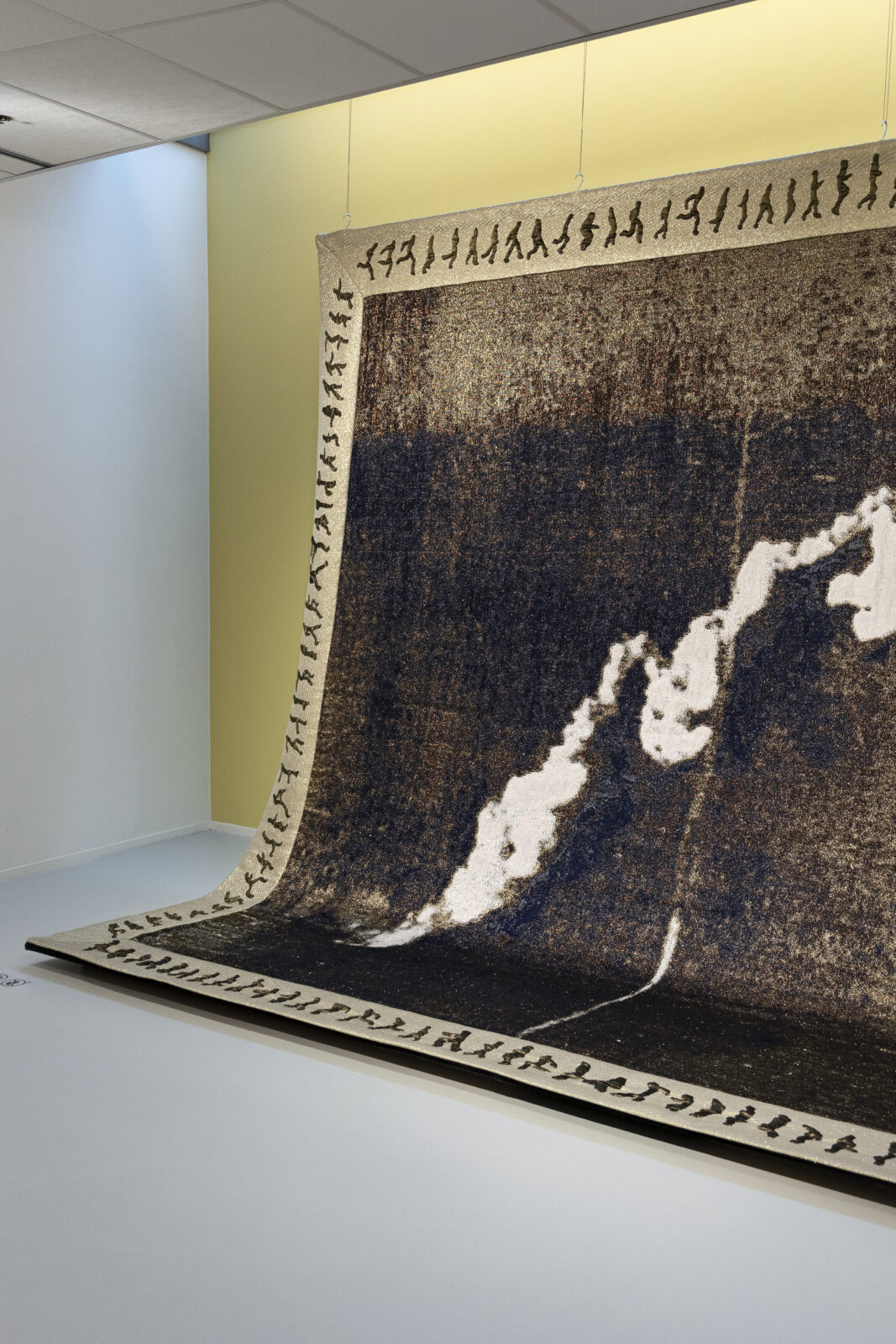De garens voor dit tafereel zijn vooral gekozen op grond van kleur, reflectie en transparantie. Door hun uiteenlopende eigenschappen ontstaan verrassende structuren in het oppervlak, die bepalend zijn voor de reflectie. De afbeelding is ‘ingelijst’ in een apart geweven gouden lijst, waarin 150 kleine mensfiguren als in een stop-motion reeks achter elkaar aanrennen. Land ontleende de figuren aan de foto’s van Eadweard Muybridge, boetseerde ze in deeg, en fotografeerde de gebakken beeldjes. Het project werd mogelijk gemaakt door de Van Reekum Cultuurprijs 2023 en was in 2024 te zien in het Huygensgebouw van de Radboud Universiteit in Nijmegen. In december van dat jaar is het verhuisd naar Apeldoorn; daar is het nog tot april 2025 in Museum CODA te zien.