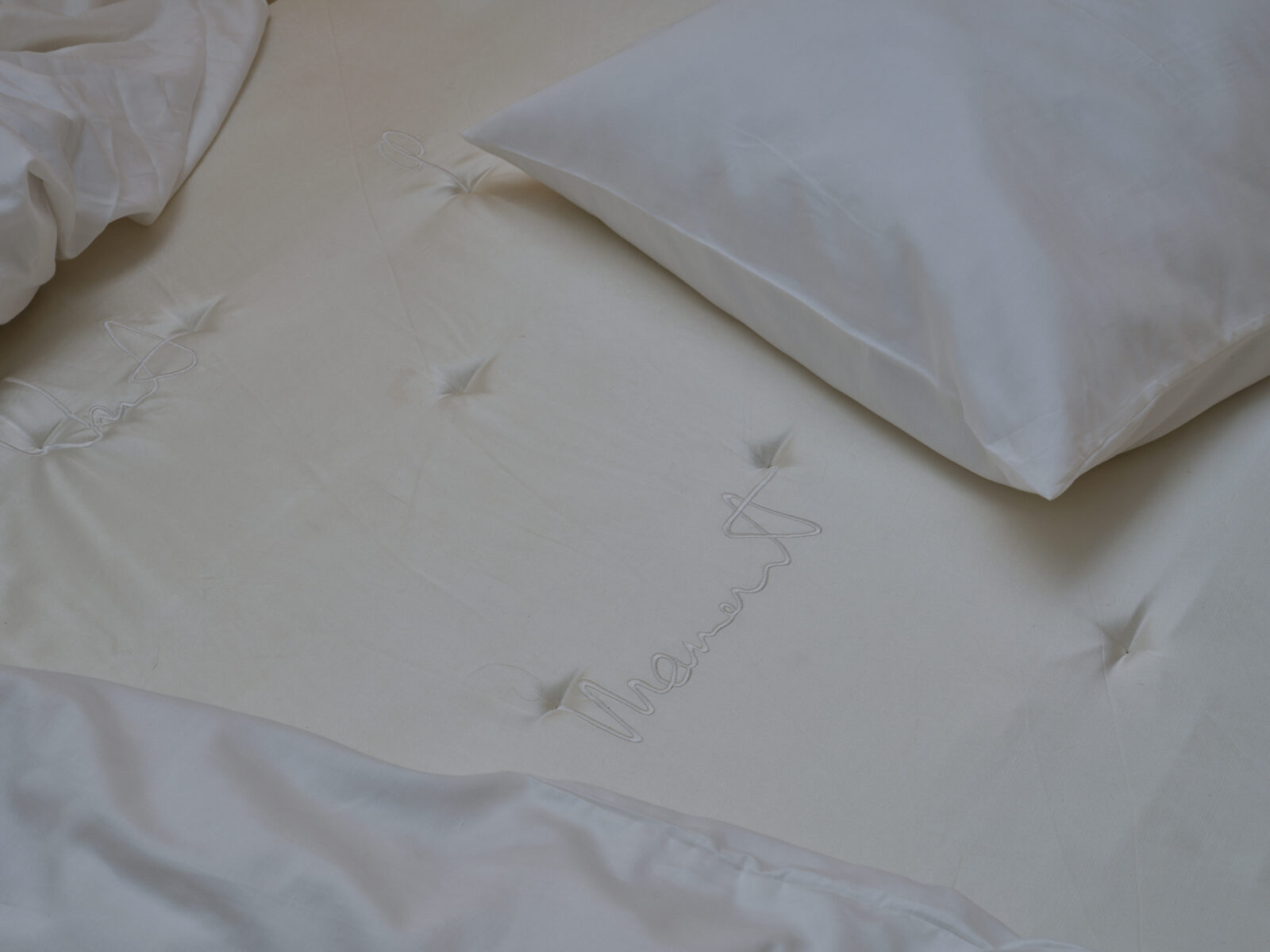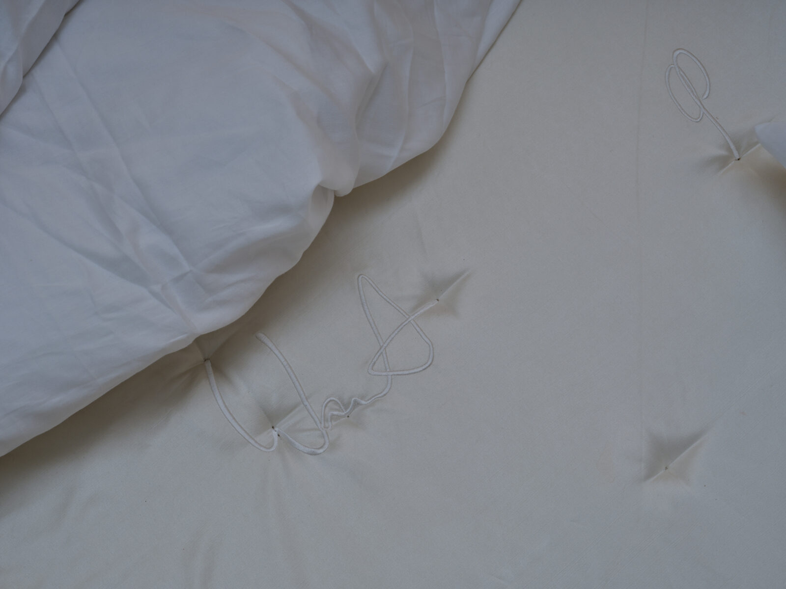 Geïnspireerd door hoe zij vroeger met haar zusje hun eigen wereld creëerden op het bed van hun ouders, wil Kluytenaar met dit ontwerp een aantrekkelijke ruimte voor verbeelding creëren en een veilige plek om persoonlijk gevoelige onderwerpen te bespreken. De teksten zijn in een deels onleesbaar handschrift geborduurd met viscose rayon garen op een overtrek voor een matras van 140 bij 200 cm.