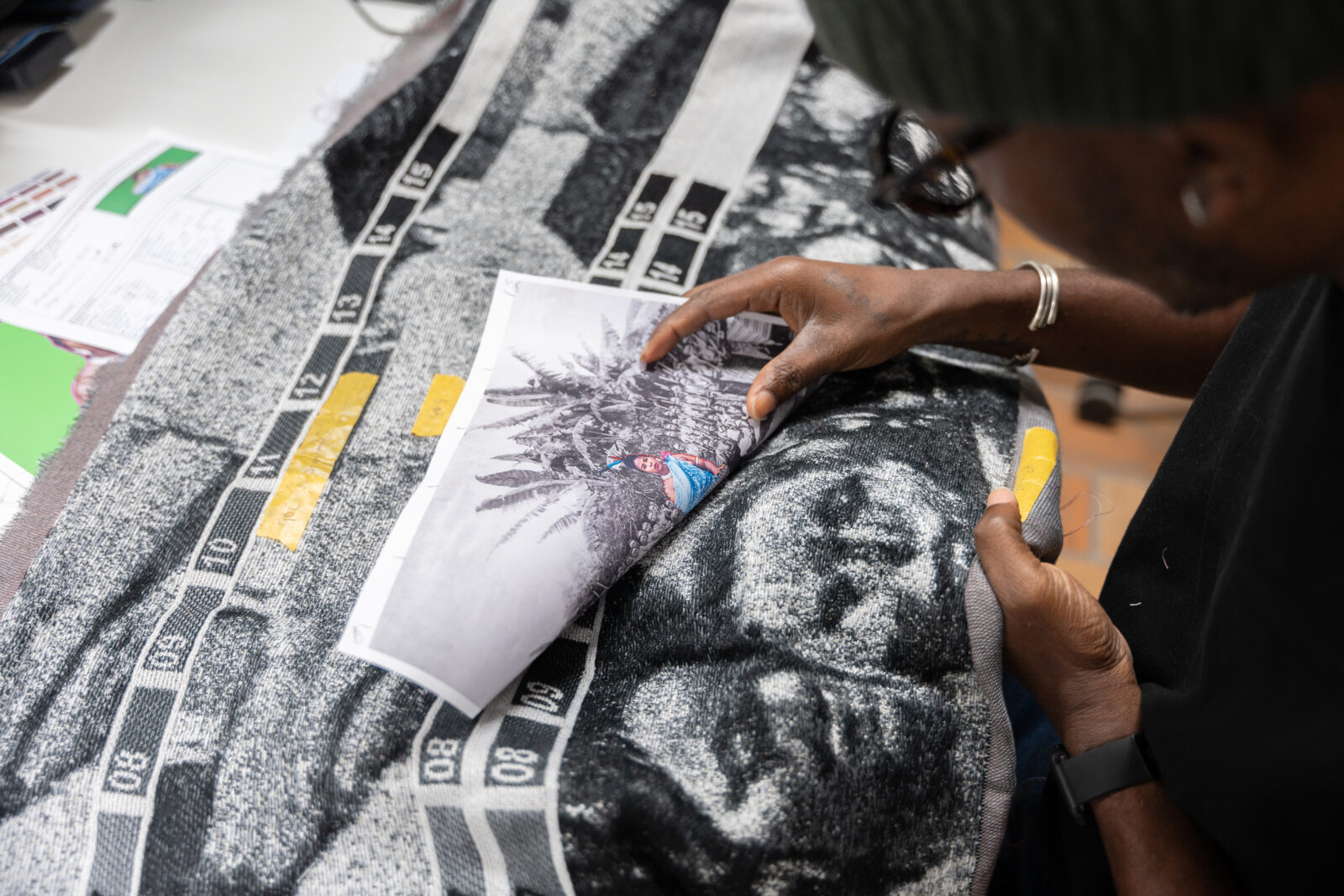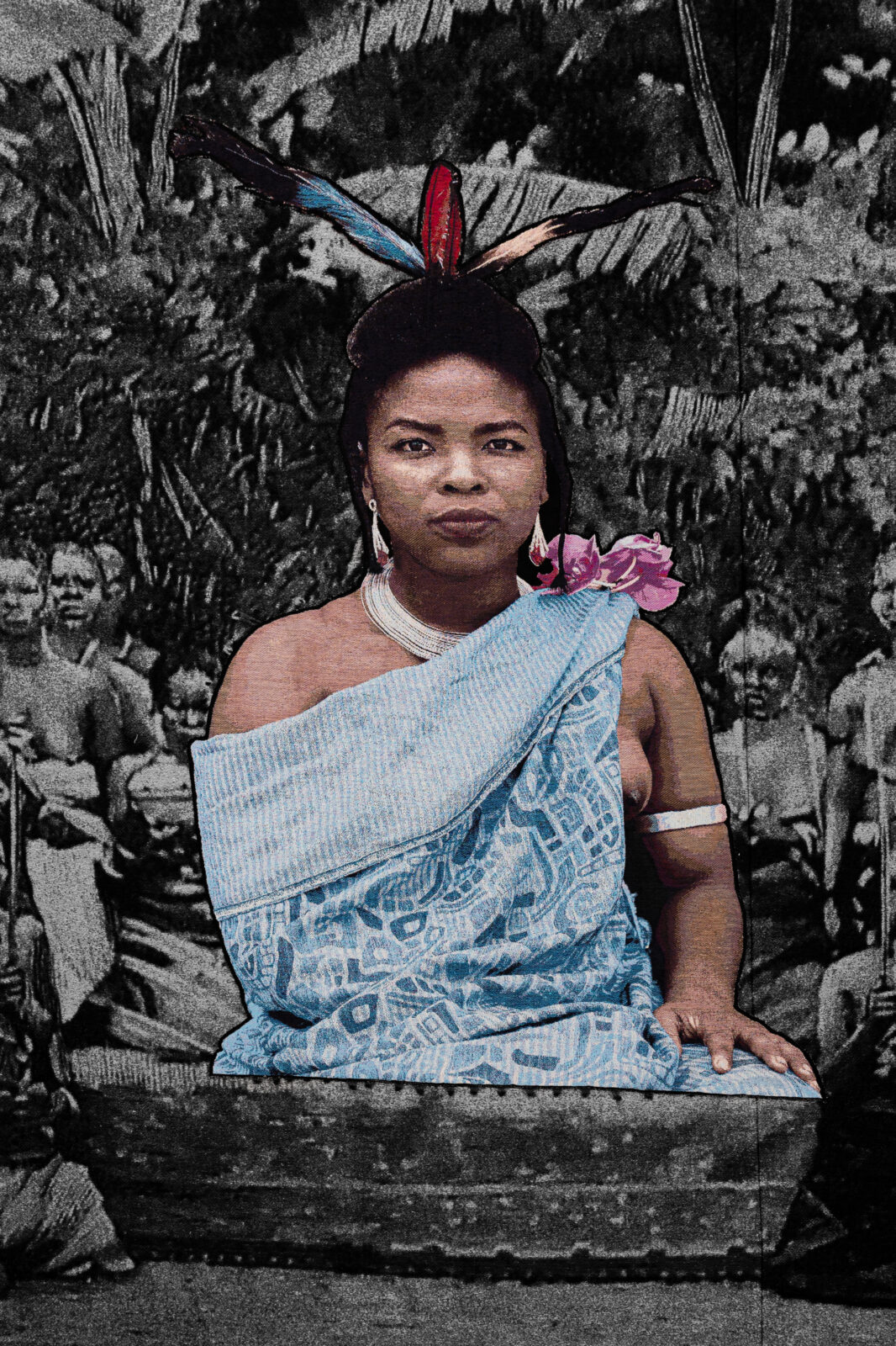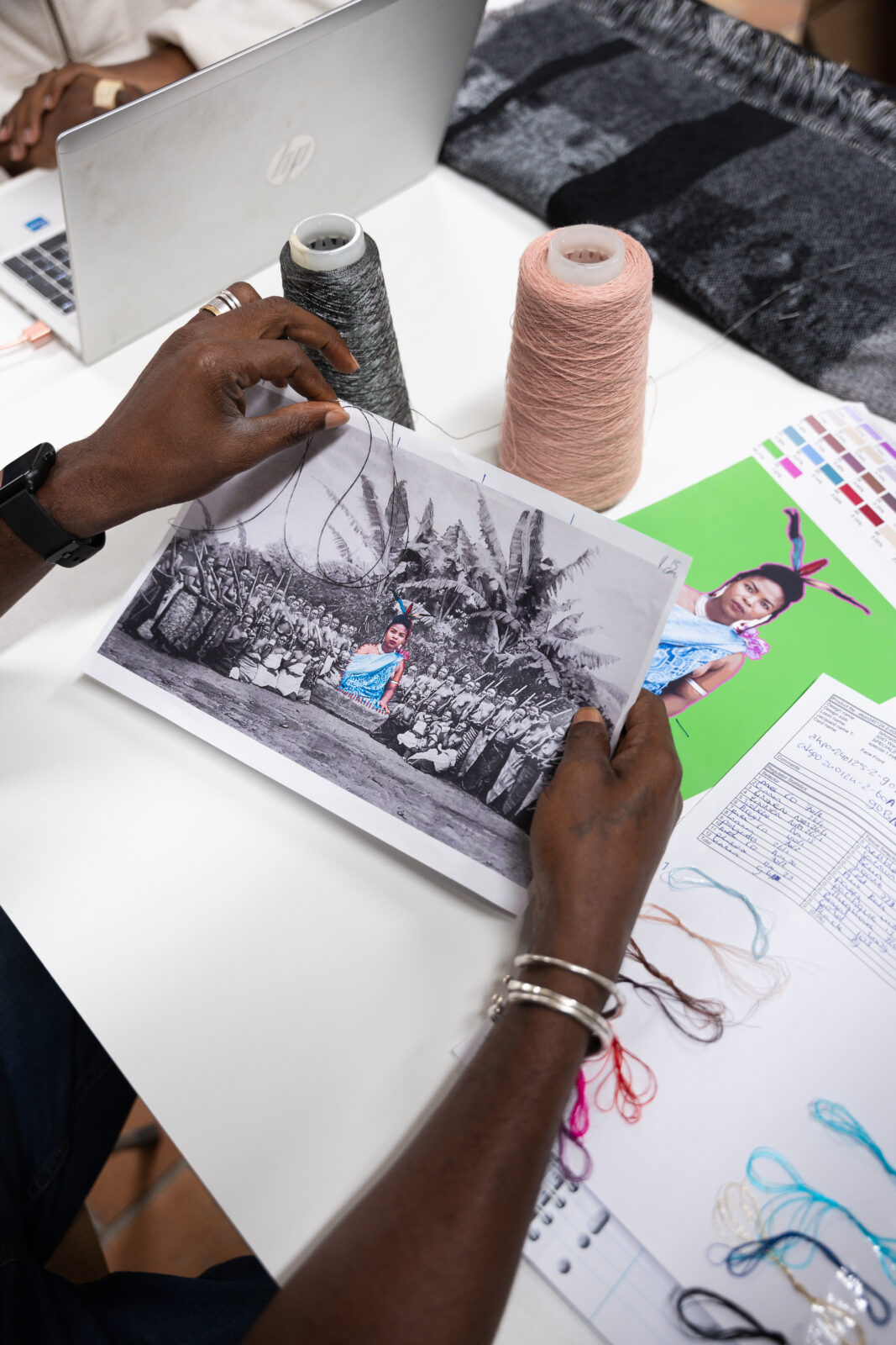 In het lab werden hier twee losse wandkleden voor geweven, in twee verschillende soorten stof. De ene is het archiefbeeld, geweven met zwarte, witte en zilveren garens. Het gebruik van flotteringen zorgt hier voor de vaagheid die de oude foto ook vertoont. De gekleurde applicatie van de koningin werd apart geweven. Daarin zijn veel fijnere, felgekleurde en glanzende garens gebruikt, met gouden draden voor haar accessoires en sieraden. In Venetië naaide Akpo de al bevestigde applicatie nog eens extra vast met dikke rode steken die de vervanging benadrukken. In de tentoonstelling Makersgeheimen #4 in het TextielMuseum zijn tot de zomer van 2025 samples en schetsen uit het maakproces te zien.