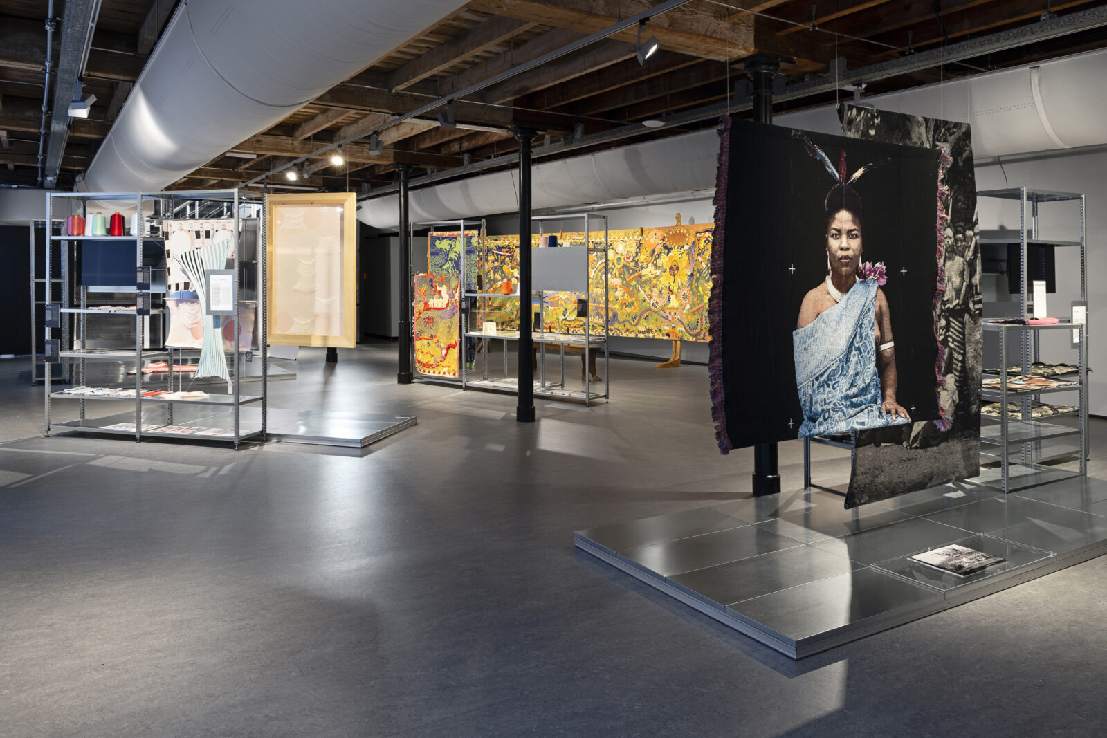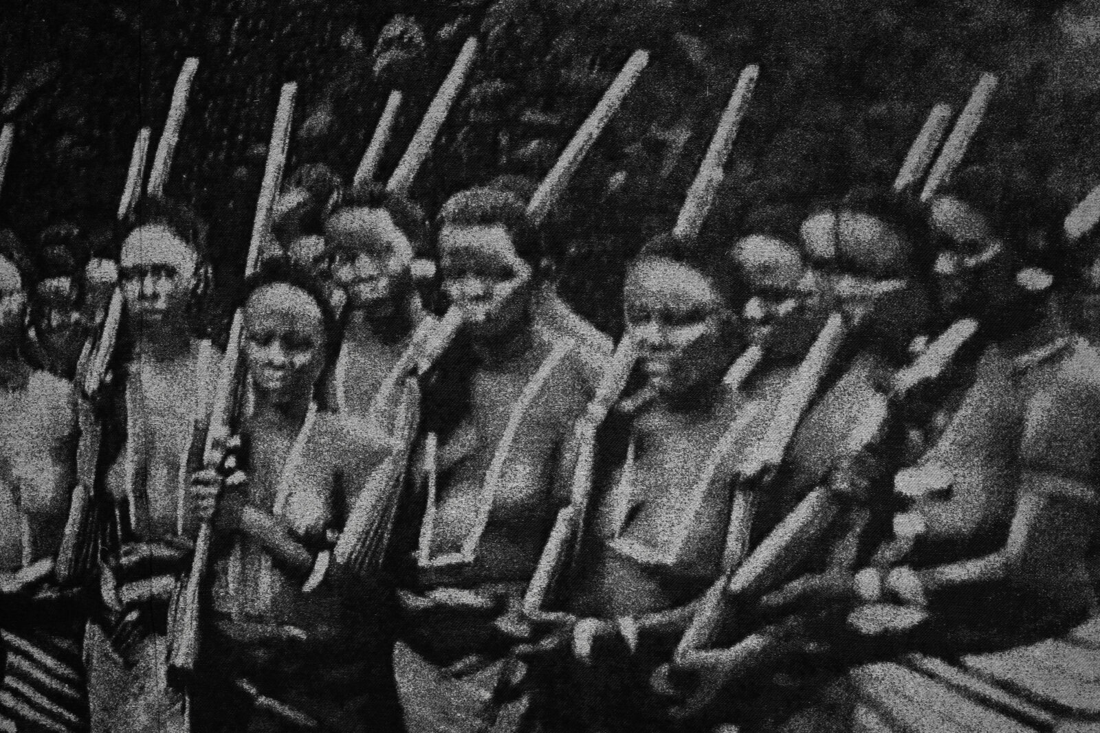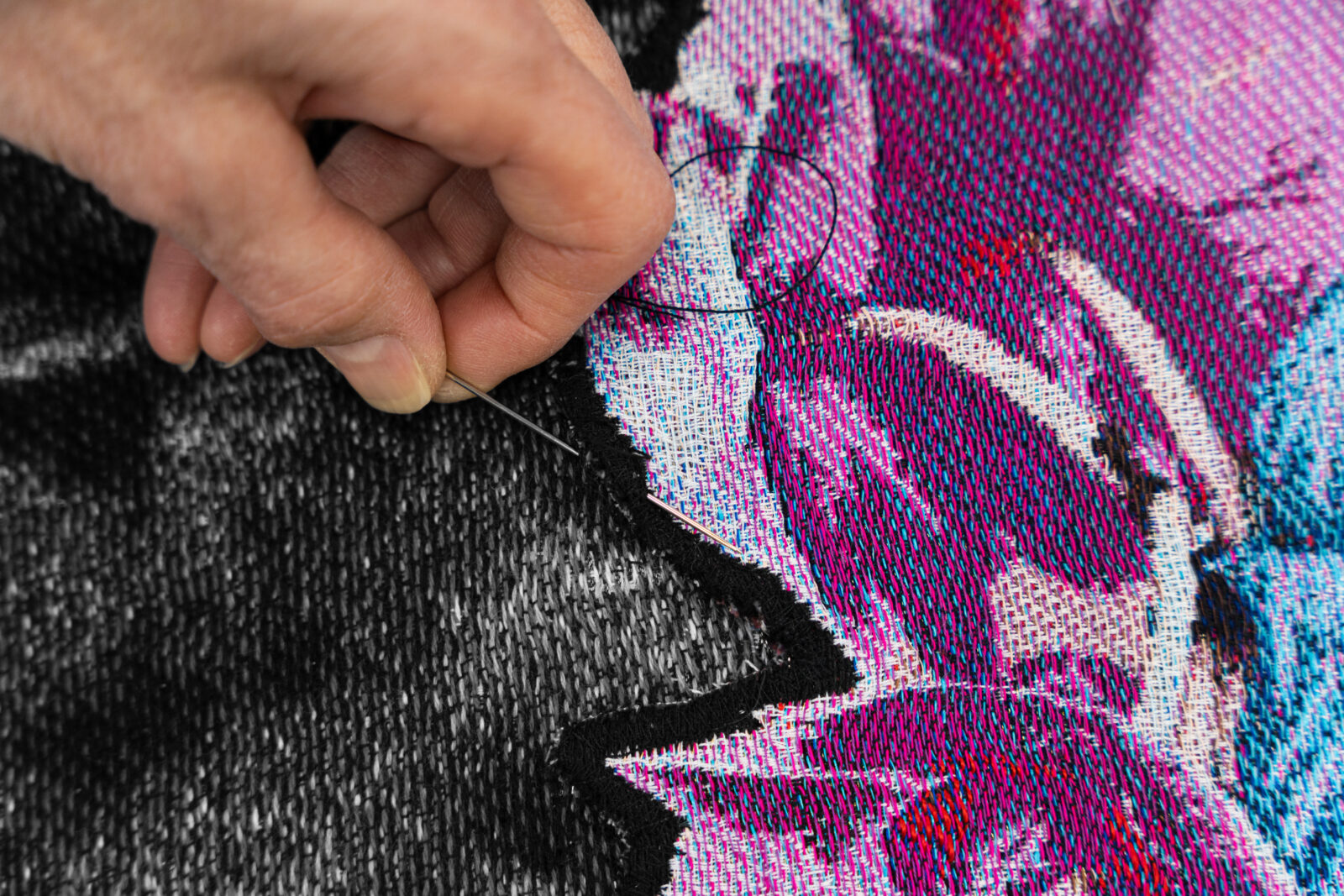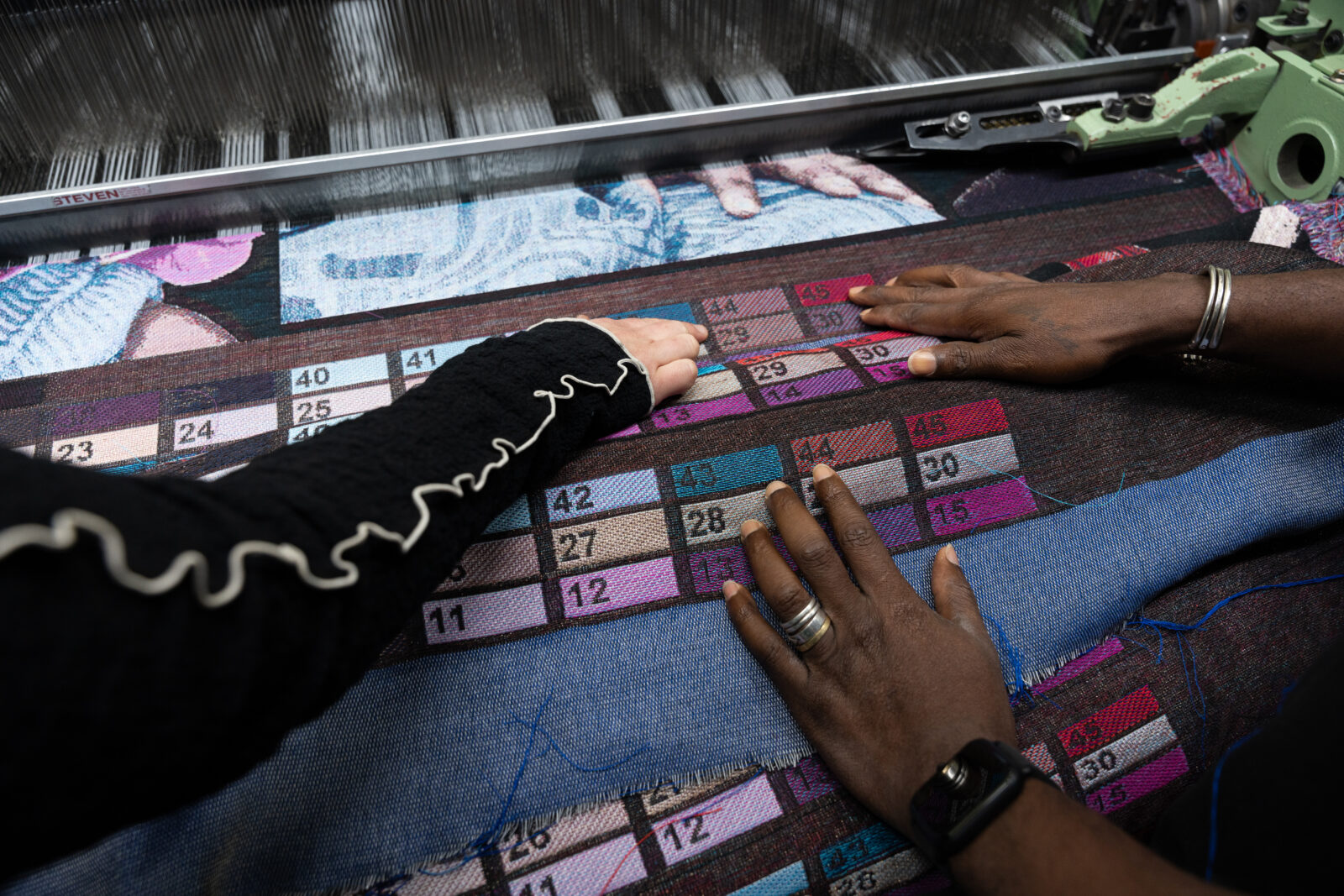 In het lab werden hier twee losse wandkleden voor geweven, in twee verschillende soorten stof. De ene is het archiefbeeld, geweven met zwarte, witte en zilveren garens. Het gebruik van flotteringen zorgt hier voor de vaagheid die de oude foto ook vertoont. De gekleurde applicatie van de koningin werd apart geweven. Daarin zijn veel fijnere, felgekleurde en glanzende garens gebruikt, met gouden draden voor haar accessoires en sieraden. In Venetië naaide Akpo de al bevestigde applicatie nog eens extra vast met dikke rode steken die de vervanging benadrukken. In de tentoonstelling Makersgeheimen #4 in het TextielMuseum zijn tot de zomer van 2025 samples en schetsen uit het maakproces te zien.