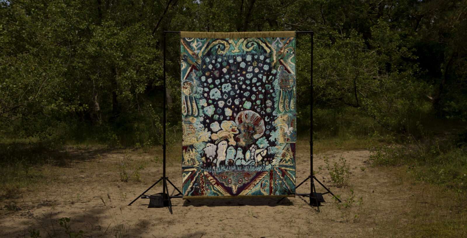 Bijzonder is dat er verschillende beelden op de voor- en achterzijden zijn geweven. Op de voorkant staat een kleurrijke voorstelling van circa vijftig verschillende tinten. De achterkant laat iets heel anders zien: een eenvoudiger beeld dat uit vier kleuren is opgebouwd. Een technische uitdaging voor de productontwikkelaar, omdat in het programma dat de machine aanstuurt maar één beeld kan worden ingevoerd. De kleden zijn geweven met een mix van matte en glanzende garens: linnen, gerecycled polyester, veluto, merinowol, mohair, lurex en viscose.