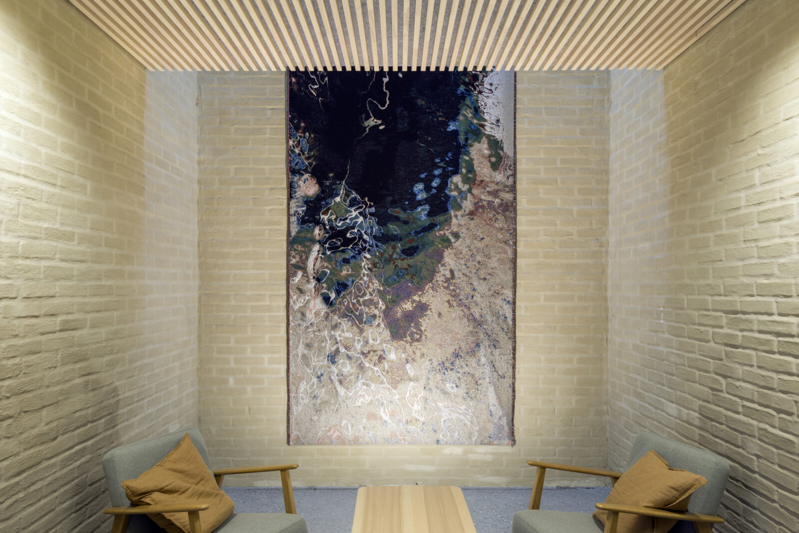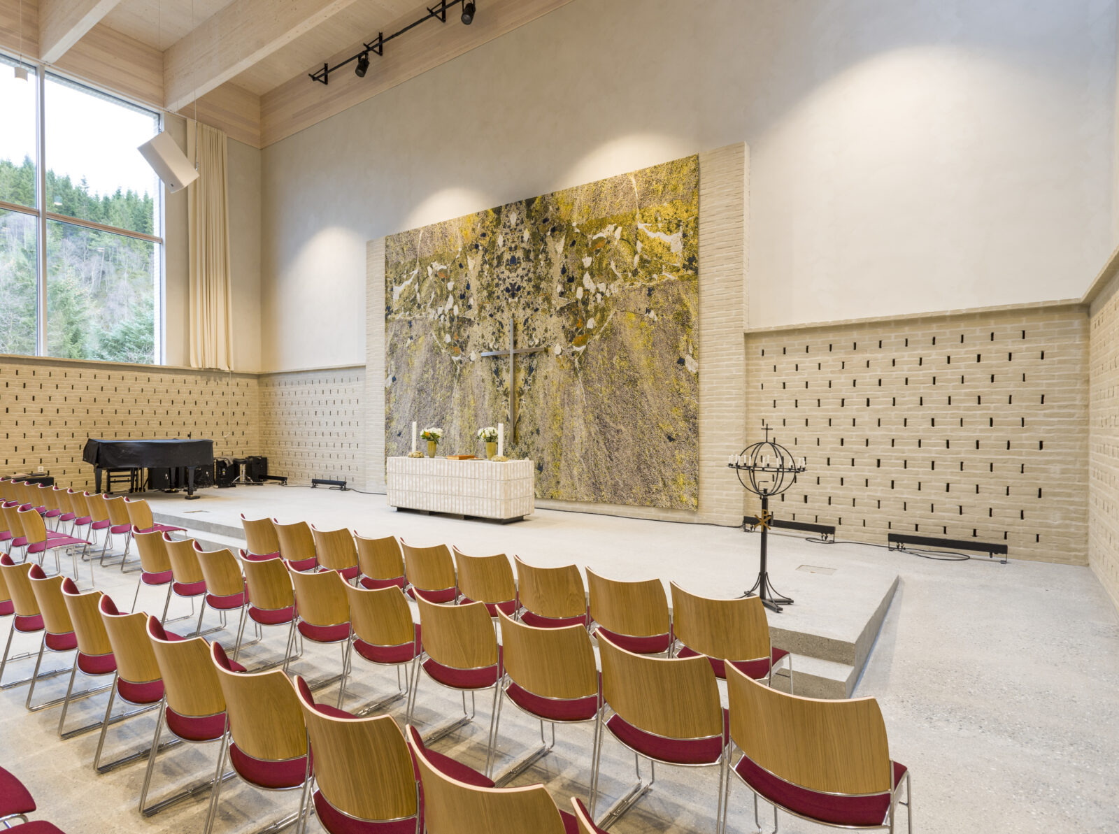 Kari Dyrdal heeft in 2024 aan verschillende weefprojecten in het TextielLab gewerkt. Voor de nieuwe Saedalen Kirke in het Noorse Bergen ontwierp zij twee wandkleden: het hoofdaltaarstuk en nog een kleinere voor in de sacristie.
