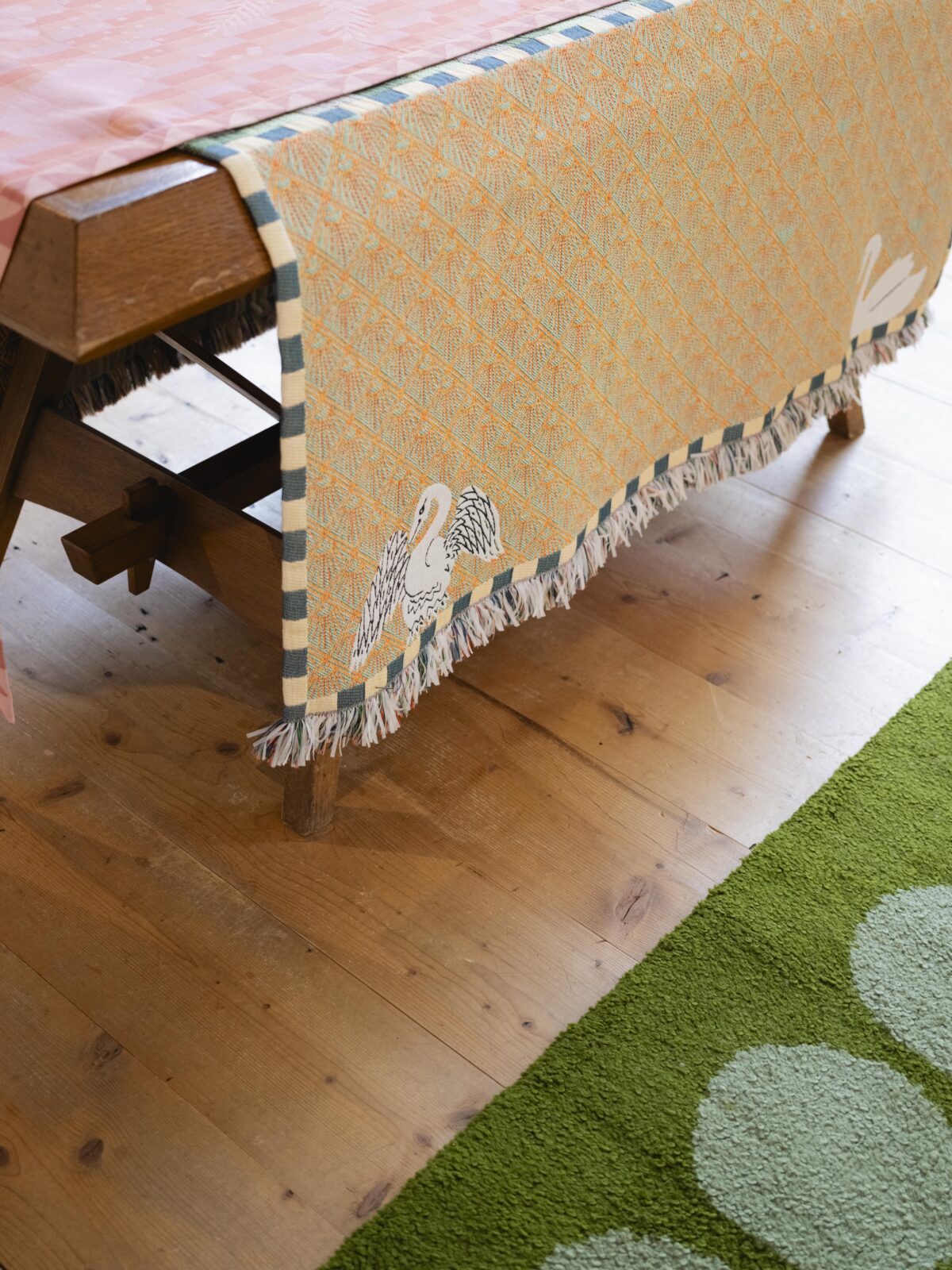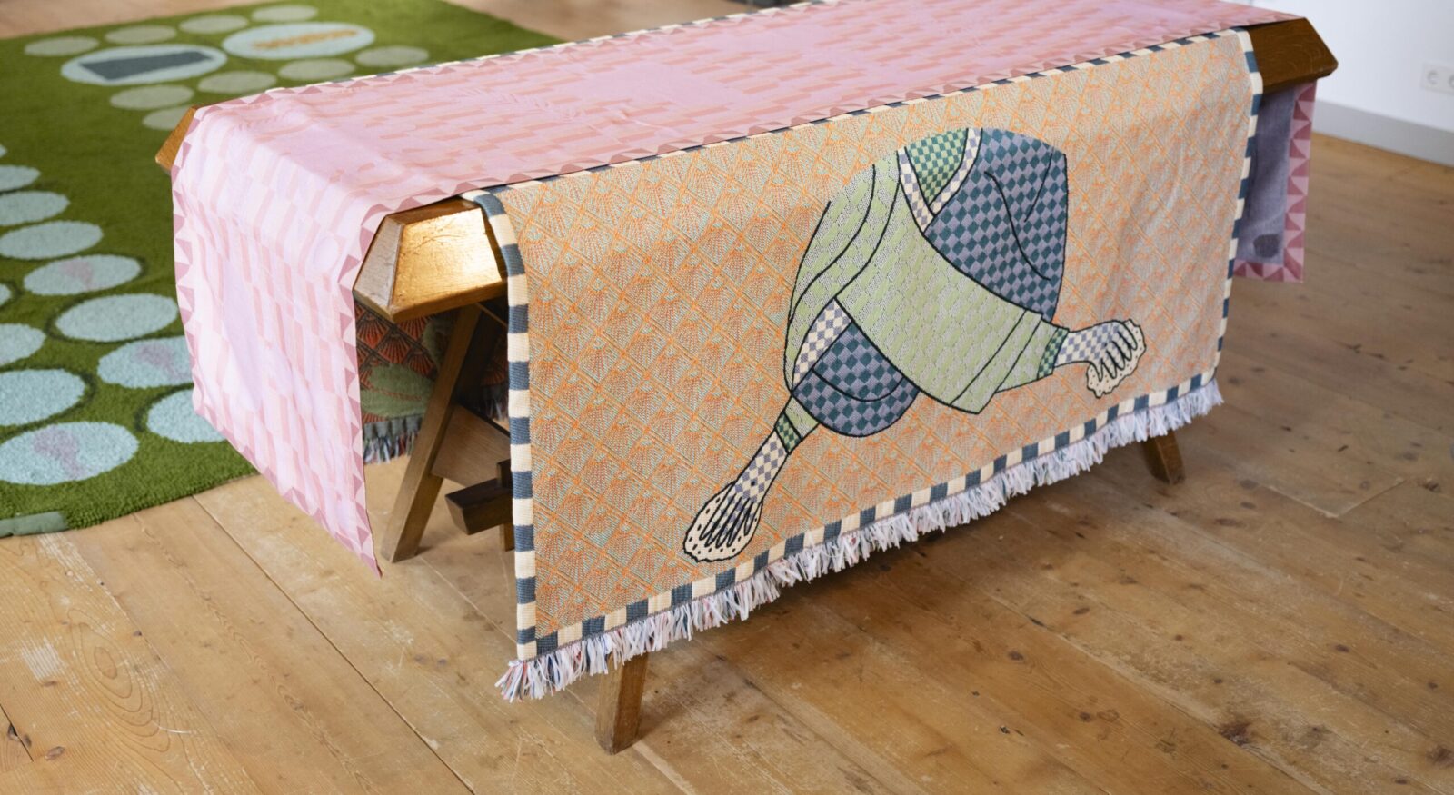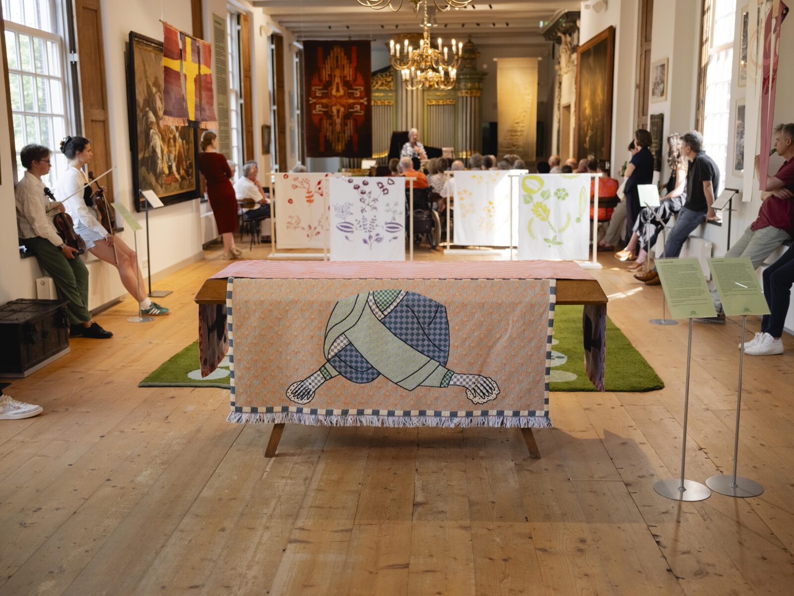 Het jacquardgeweven kleed verbeeldt een eigentijdse benadering van het traditionele lutherse avondmaalsthema; het verkent zowel de diepte van het geloof als de diversiteit van de hedendaagse kunst. De inspiratie was het Bijbelverhaal van de Emmaüsgangers, waarbij de herrezen Christus verschijnt aan twee mannen die samen op weg zijn. Het verhaal is geliefd binnen de christelijke LHBTI+ gemeenschap, omdat Jezus hierin verschijnt aan twee vrienden, aan mensen die ‘vrijwillig bij elkaar horen’. De typisch lutherse zwaantjes zijn als een soort knipoog aan de achterkant verwerkt. Het kleed is geweven in een mix van wol en acryl; de tafelloper die eroverheen wordt gelegd is van katoen gemaakt.