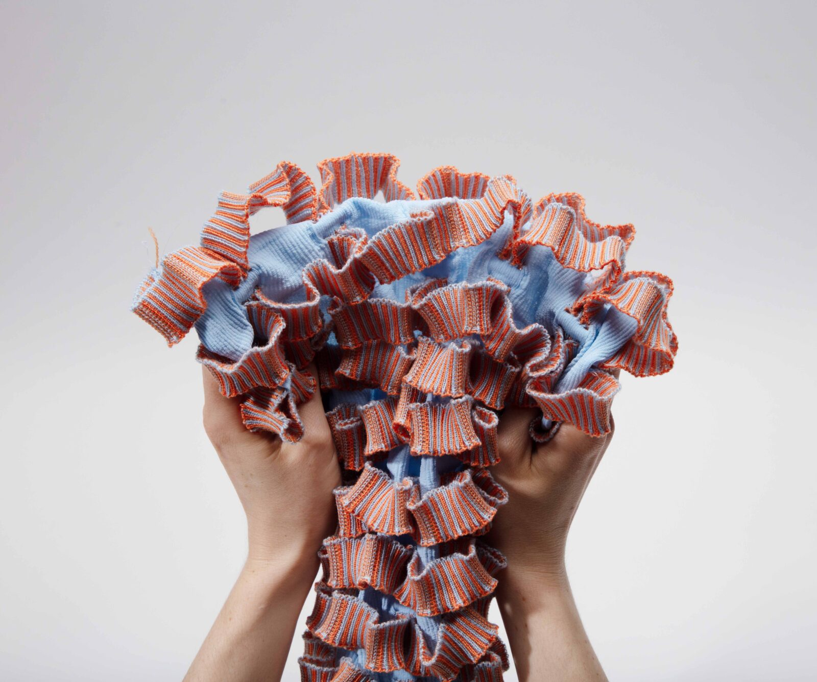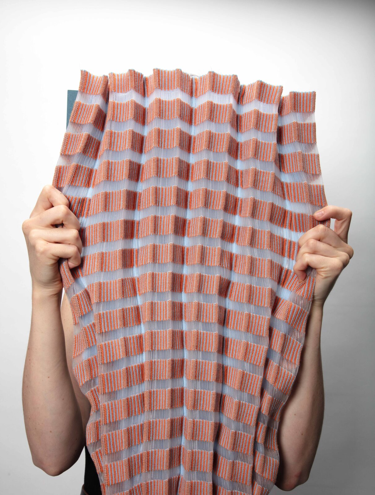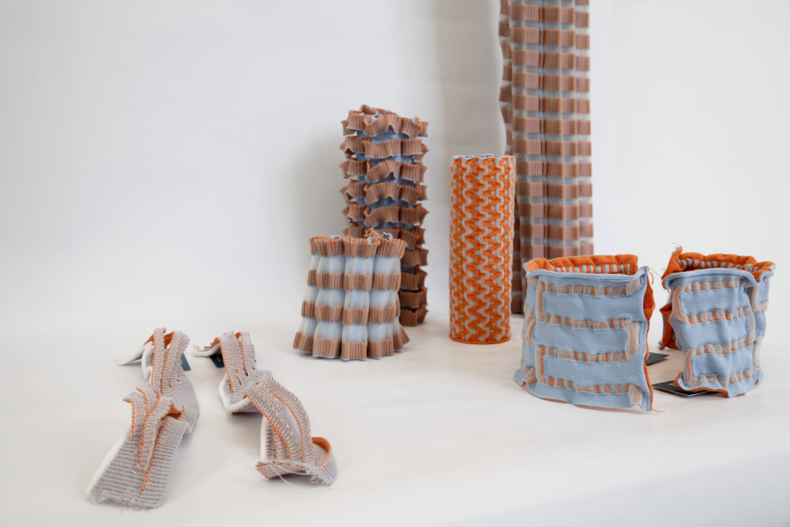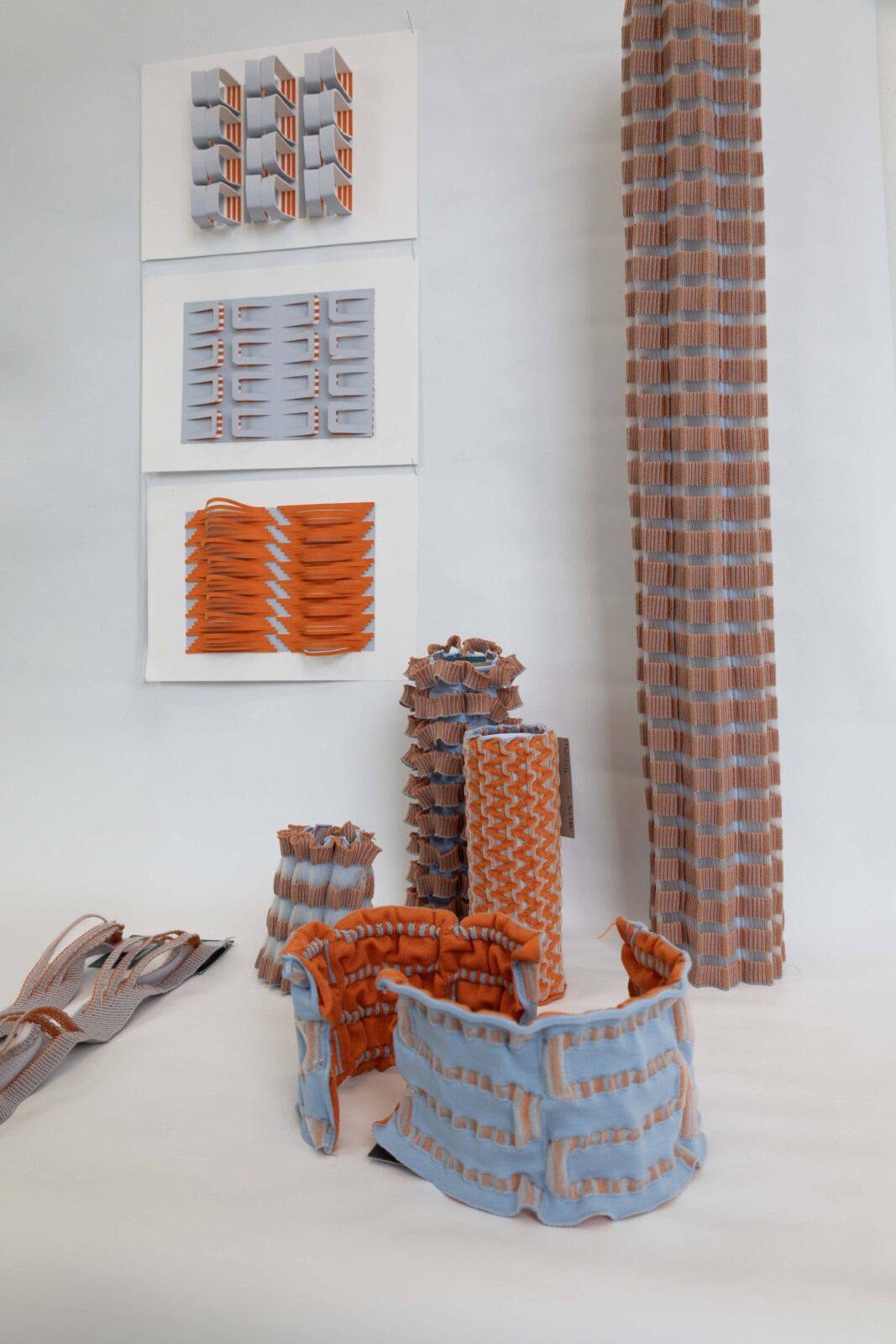 In het voorjaar van 2024 werd Louisa Muir-Little geselecteerd om haar afstudeerproject in het TextielLab te komen ontwikkelen. Gefascineerd door de bijna bouwkundige structuren van breisels, startte ze een materiaalonderzoek: in hoeverre kun je architectonische vormen en texturen op de vlakbreimachine recreëren? Samen met productontwikkelaar Damien Semerdjian lukte het om eigenschappen van de Muir-Little’s 3D-modellen van papier en foam over te nemen in gebreide samples.