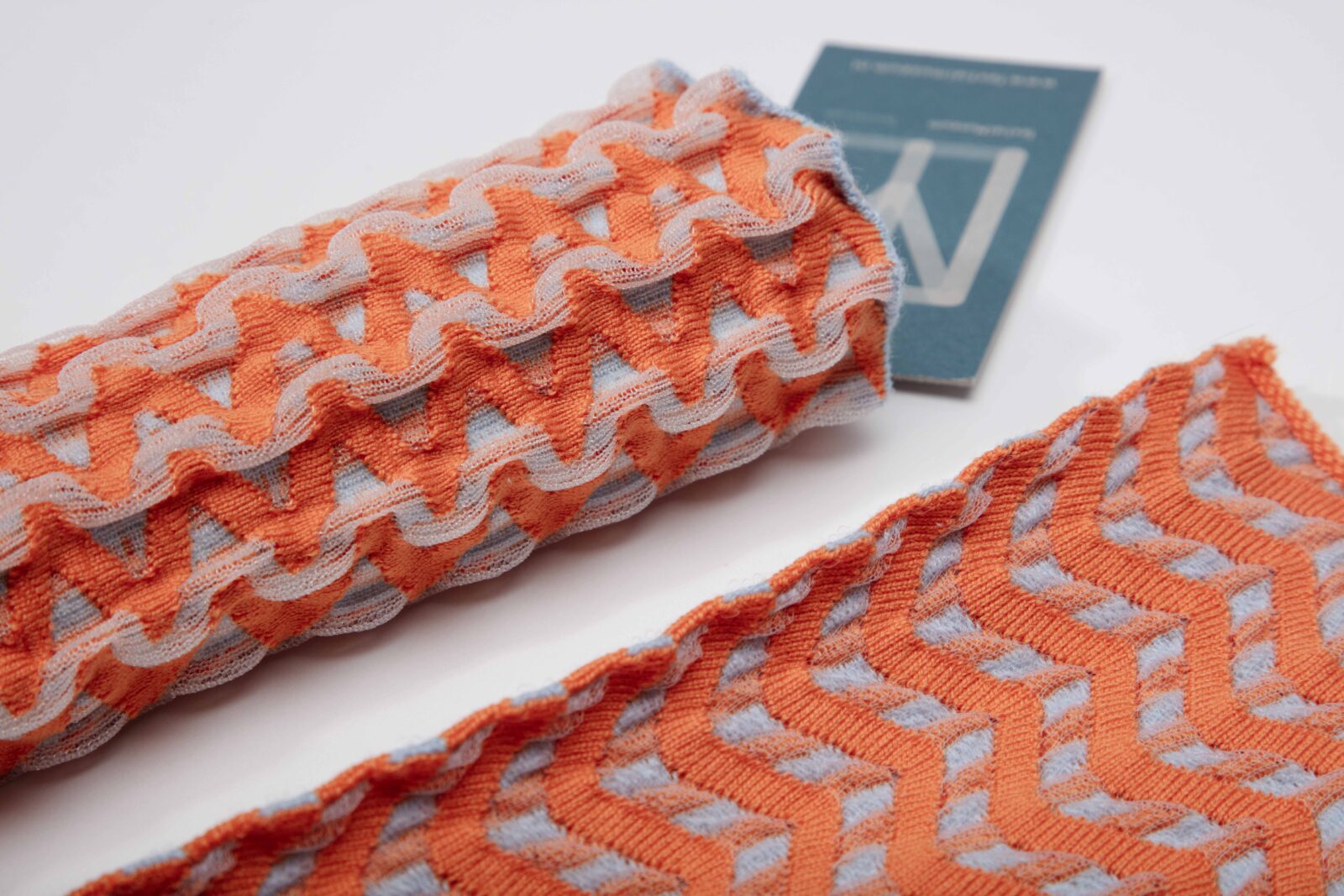Door gebruik te maken van de zogenaamde dubbeldoektechniek en een garencombinatie van elastaan en transparant polyester monofilament konden stevige structuren ontstaan. Er is bewust gekozen voor slechts twee contrasterende kleuren – blauw en oranje – om de focus op de textuur te houden. Met het resultaat behaalde Muir-Little in september 2024 haar master aan het Royal College of Art in Londen. Op haar eindexamenpresentatie werden de gemaakte stalen als gebreide torens naast de papieren 3D-modellen geplaatst: Texture perception slaat een brug tussen breiwerk en architectuur.