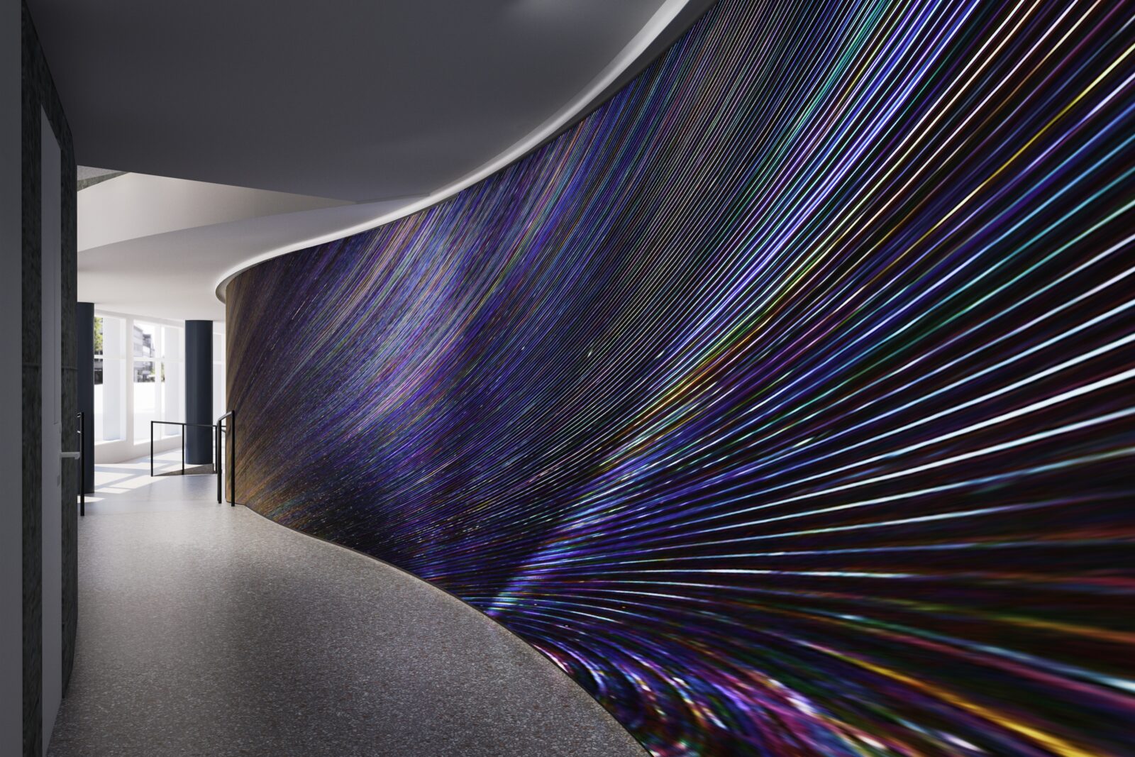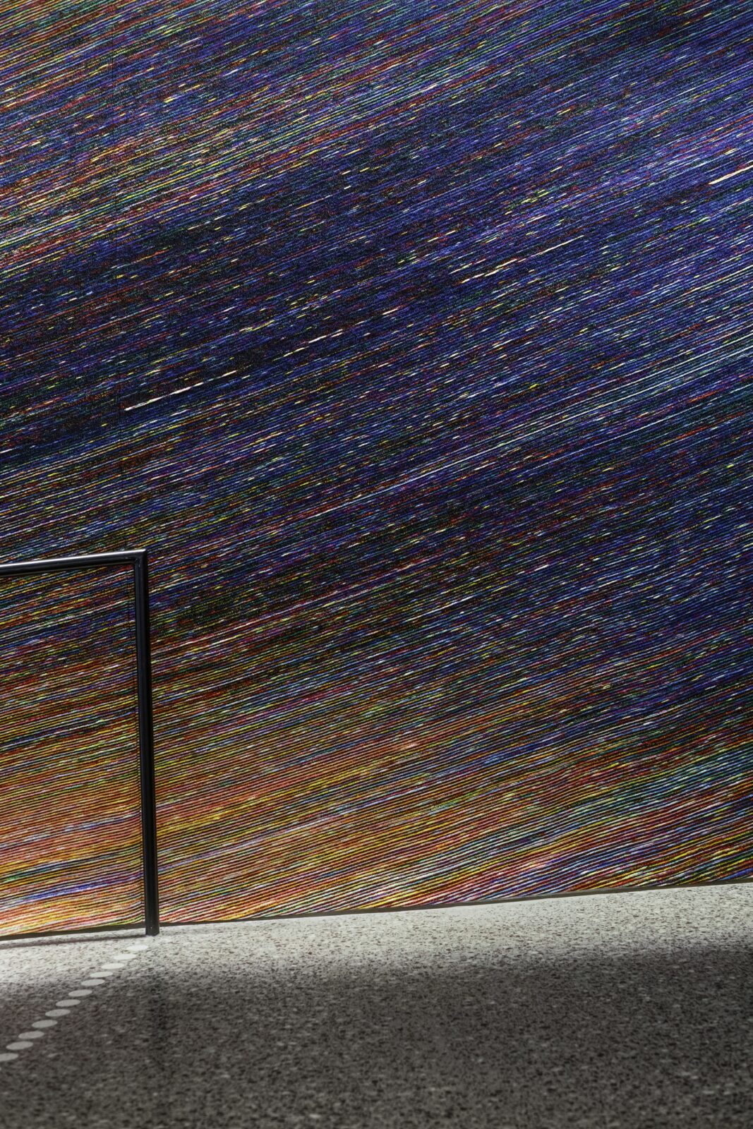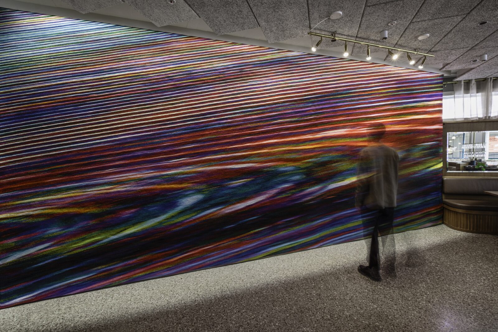 Het ontwerp is op maat gemaakt voor een golvende muur op de benedenverdieping van het gebouw, die ook vanaf buiten goed te zien is door de ramen. Van dichtbij ervaar je de rijkdom aan details, van een afstandje openbaart zich een vloeiende beweging die als een wervelwind voorbijkomt. Om het hele kunstwerk te kunnen zien, zal de toeschouwer ook zelf in beweging moeten komen. De wandbekleding is in het TextielLab ontwikkeld op de grote weefmachine van 350 cm breed en gemaakt van Trevira CS, een vlamwerend garen afkomstig van een spinnerij in Como, Italië. Om het gewenste effect te bereiken, zijn twaalf kleurschakeringen gebruikt in de inslag en twee in de schering.