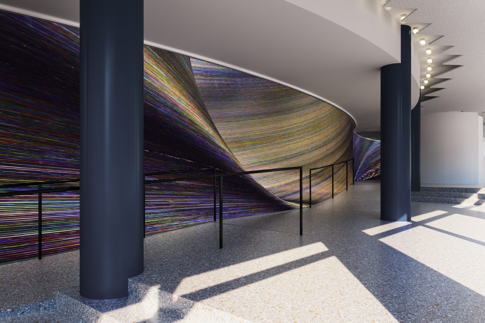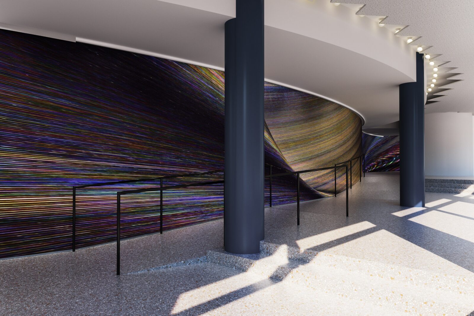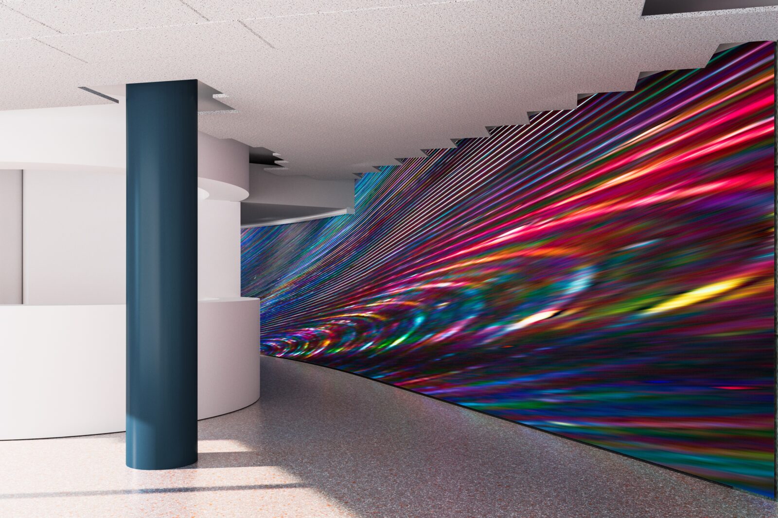 Het ontwerp is op maat gemaakt voor een golvende muur op de benedenverdieping van het gebouw, die ook vanaf buiten goed te zien is door de ramen. Van dichtbij ervaar je de rijkdom aan details, van een afstandje openbaart zich een vloeiende beweging die als een wervelwind voorbijkomt. Om het hele kunstwerk te kunnen zien, zal de toeschouwer ook zelf in beweging moeten komen. De wandbekleding is in het TextielLab ontwikkeld op de grote weefmachine van 350 cm breed en gemaakt van Trevira CS, een vlamwerend garen afkomstig van een spinnerij in Como, Italië. Om het gewenste effect te bereiken, zijn twaalf kleurschakeringen gebruikt in de inslag en twee in de schering.