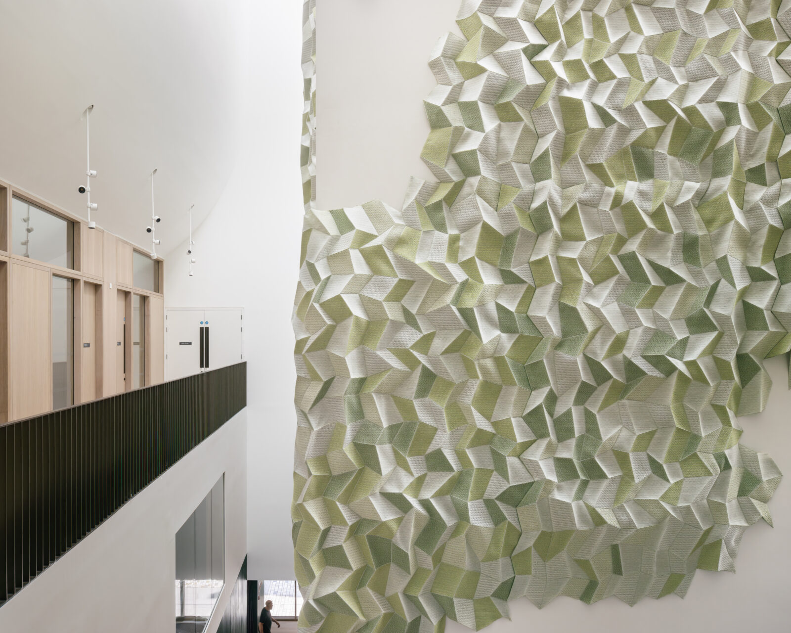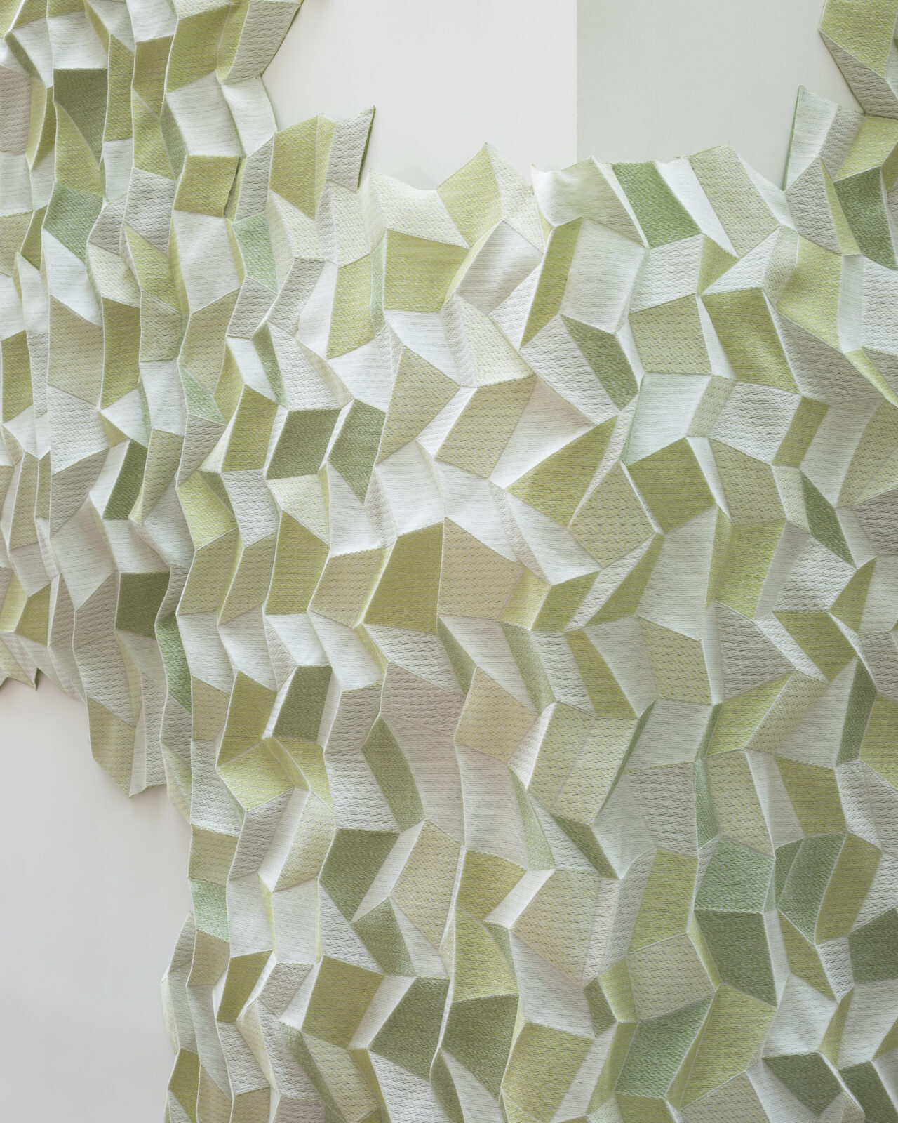 Het werk is gemaakt met een bijzondere vouwtechniek die door de jaren heen in het lab is verfijnd. Deze techniek geeft het weefsel een soort geheugen. In het maakproces vouwt de stof zichzelf door een ingenieus samenspel van bindingen en gedraaid garen. Op de weefmachine komen de facetten in verschillende groentinten al tot leven. Aan de muur laten zij in het voorbijgaan steeds iets anders zien, en doen ze denken aan het spel van wind en licht met de blaadjes van de klimop. Naast de esthetische functie is er ook een praktische functie: de brandvertragende textiele sculpturen zorgen voor een veel betere akoestiek in de ruimte.