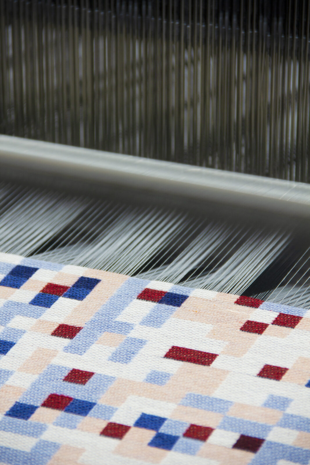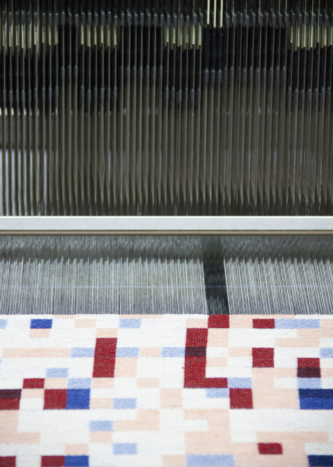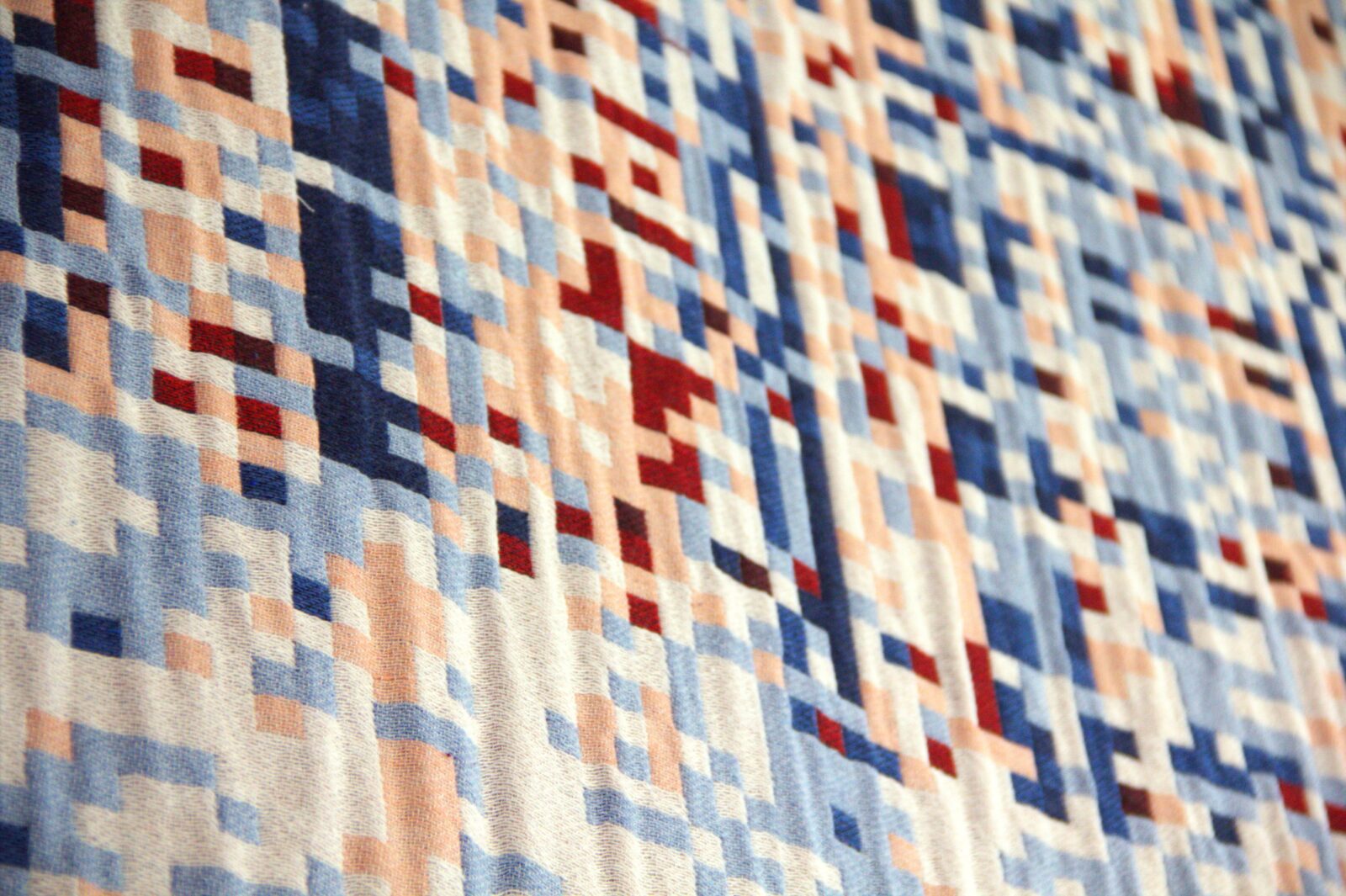 De uitdaging van werken met dit garen is dat het wisselt in dikte. Dat maakt het lastig om er een gelijkmatig weefsel mee te creëren. Het wandkleed is geweven met een zwart-witte ketting om de kleuren intenser te maken. De witte kettingdraden zijn gebruikt voor de lichte kleuren en de zwarte kettingdraden zijn gebruikt voor de donkere kleuren.