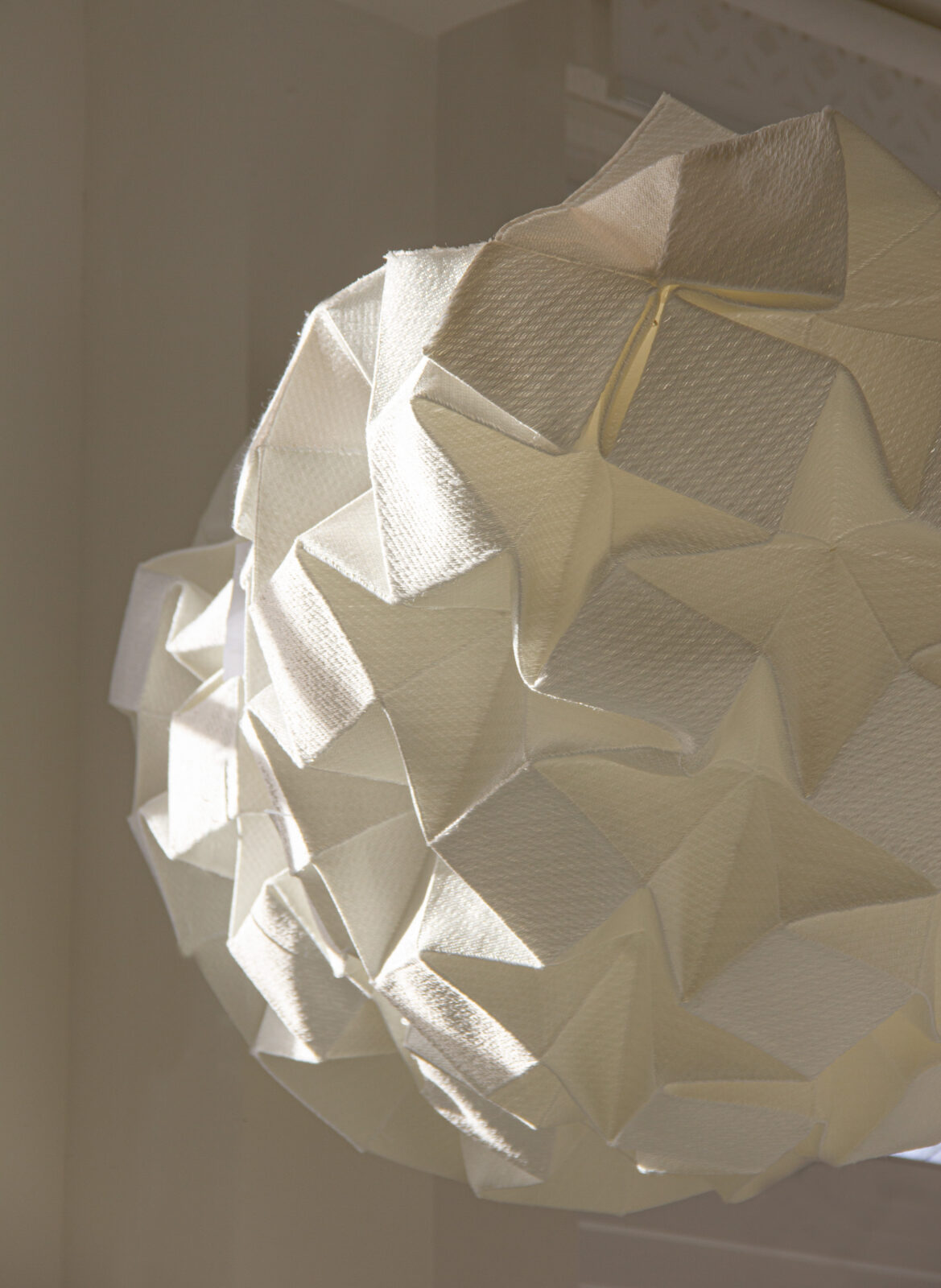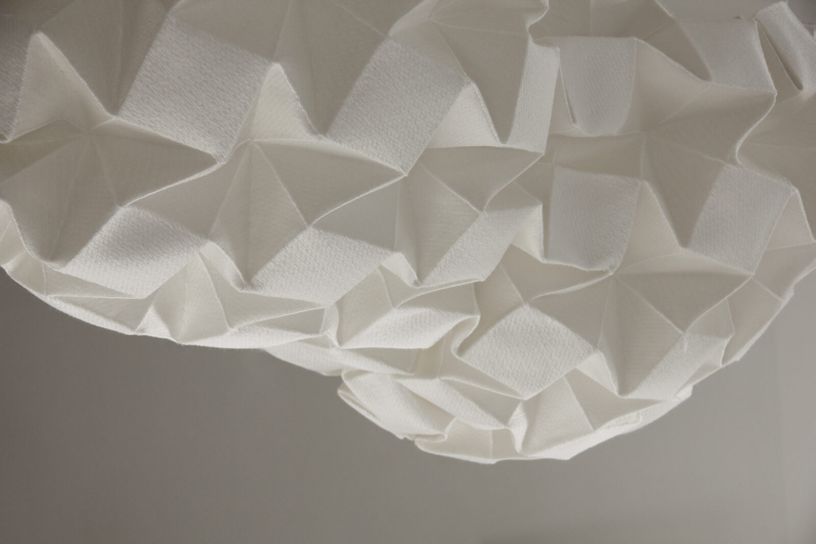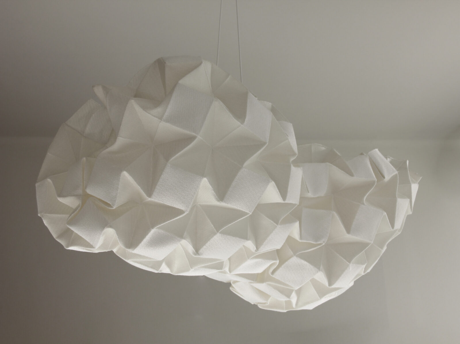 Studio Samira Boon werkte samen met Lightnet GmbH aan de verlichtingscollectie Kumo, wat het Japanse woord is voor wolk. De 3D-geweven origamistructuur bestaat uit een combinatie van vierkanten en driehoeken, die samen een organische sculpturen vormen die de kamer verlichten als bedienbare wolken.