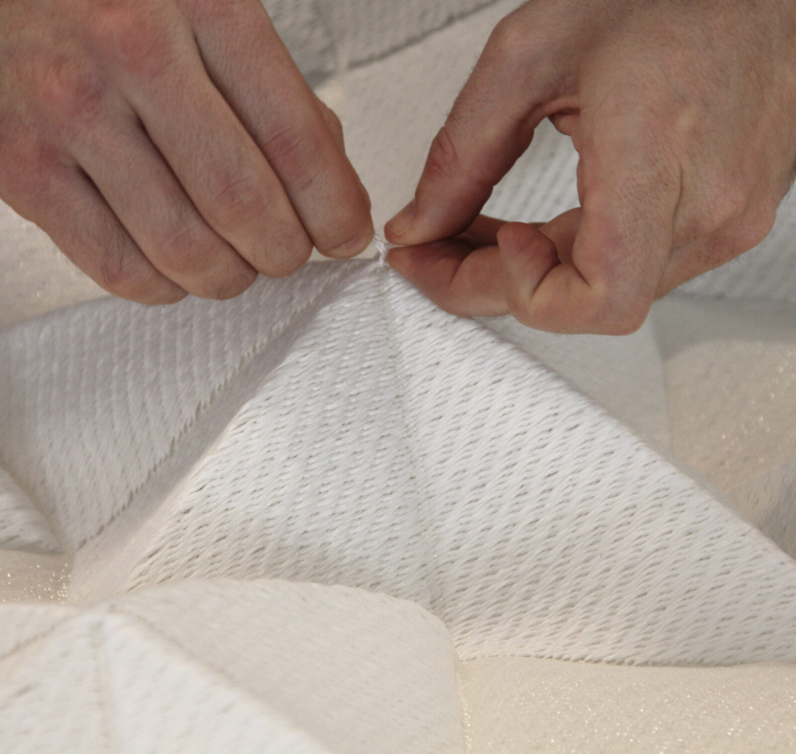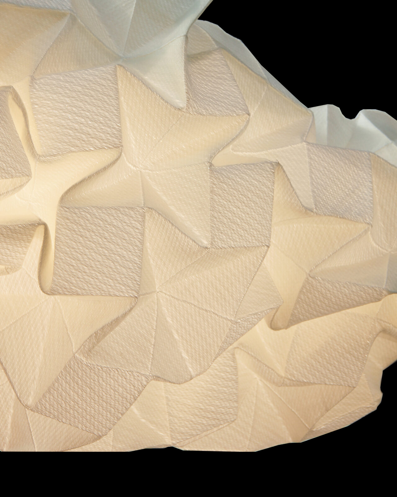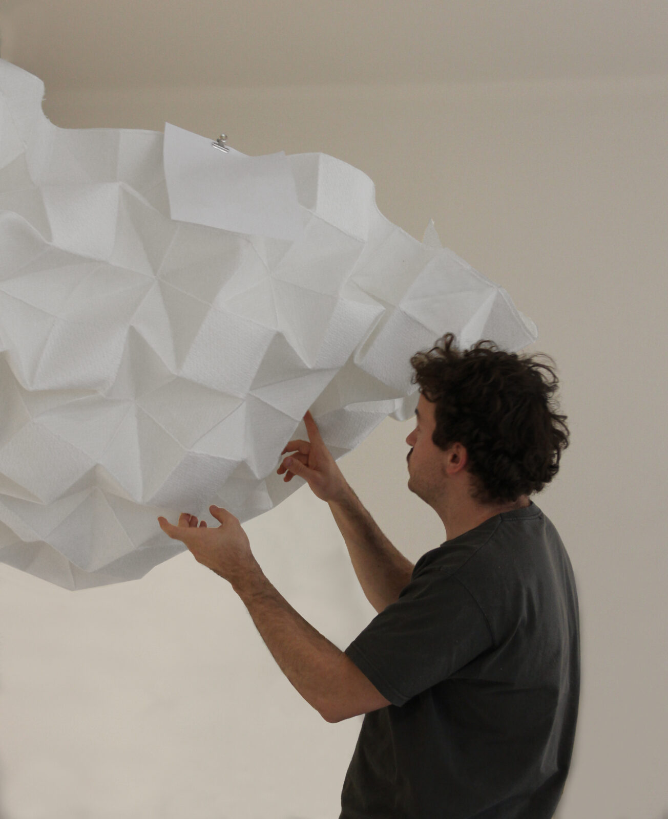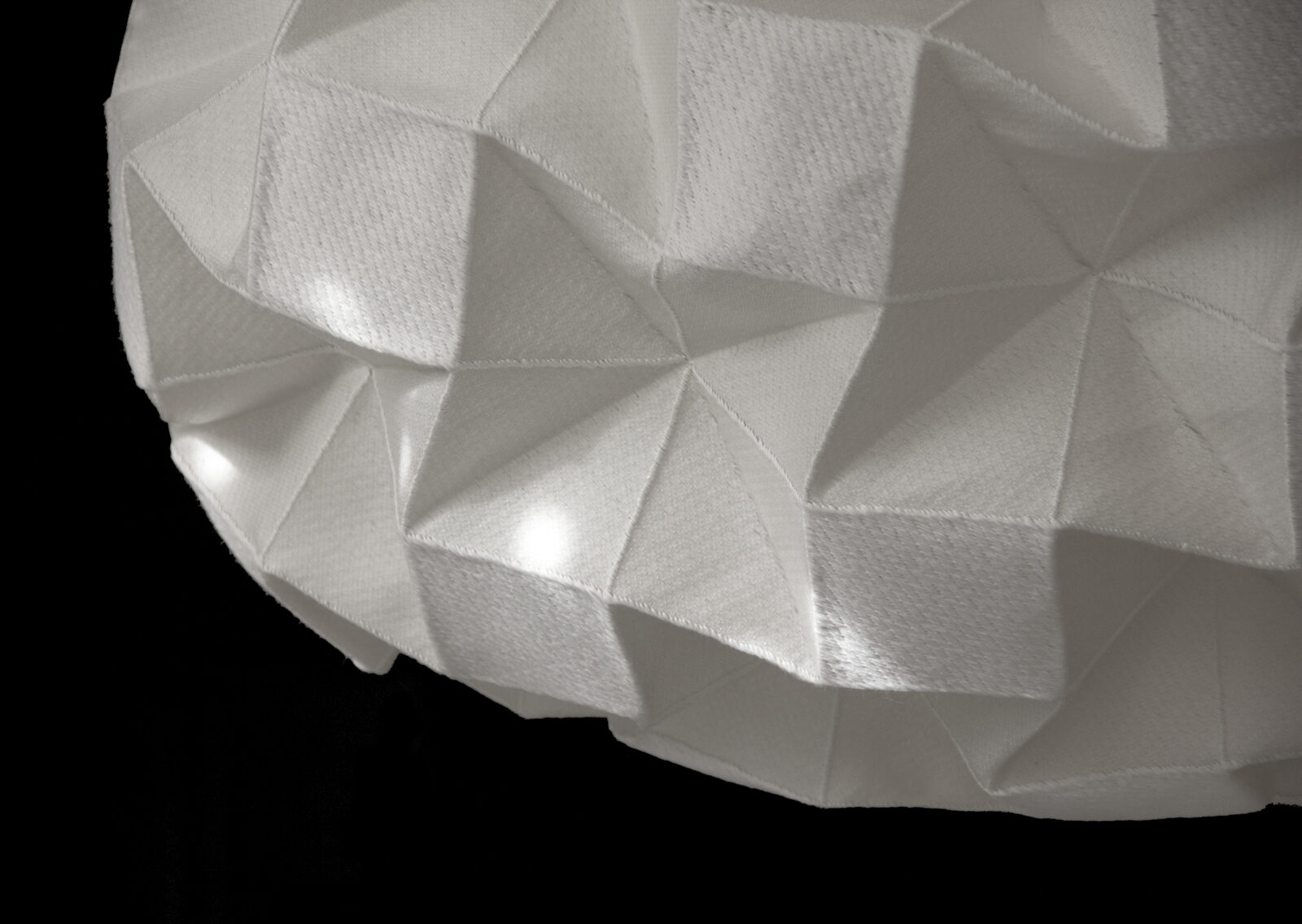 Studio Samira Boon werkte samen met Lightnet GmbH aan de verlichtingscollectie Kumo, wat het Japanse woord is voor wolk. De 3D-geweven origamistructuur bestaat uit een combinatie van vierkanten en driehoeken, die samen een organische sculpturen vormen die de kamer verlichten als bedienbare wolken.