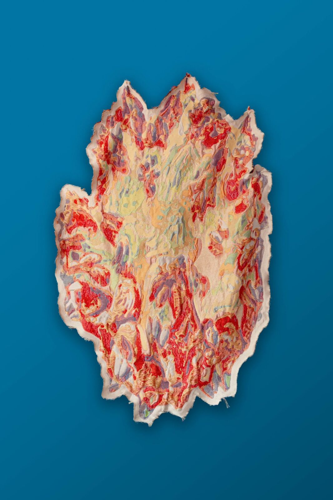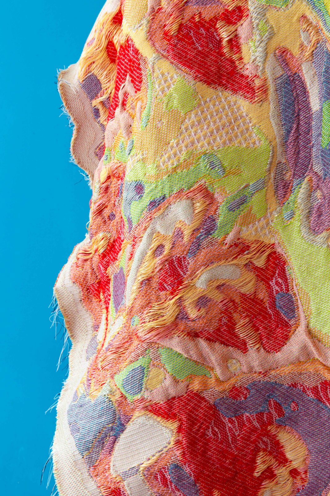 Sandra Keja Planken werkte in 2023 voor het eerst in het TextielLab aan het project Ode al mar. Dat beviel goed. In 2024 kwam ze terug naar Tilburg voor het weven van een nieuw wandkleed. Nature’s visual sound. Dit gaat ook weer over de relatie tussen mens en natuur. Om respectvol met die natuur om te gaan, werkt Keja Planken altijd met restmateriaal en gerecyclede of duurzame garens. Met de restjes die in het TextielLab te vinden waren, creëerde ze een nieuw organisme, dat als een kloppend hart aan de muur hangt.